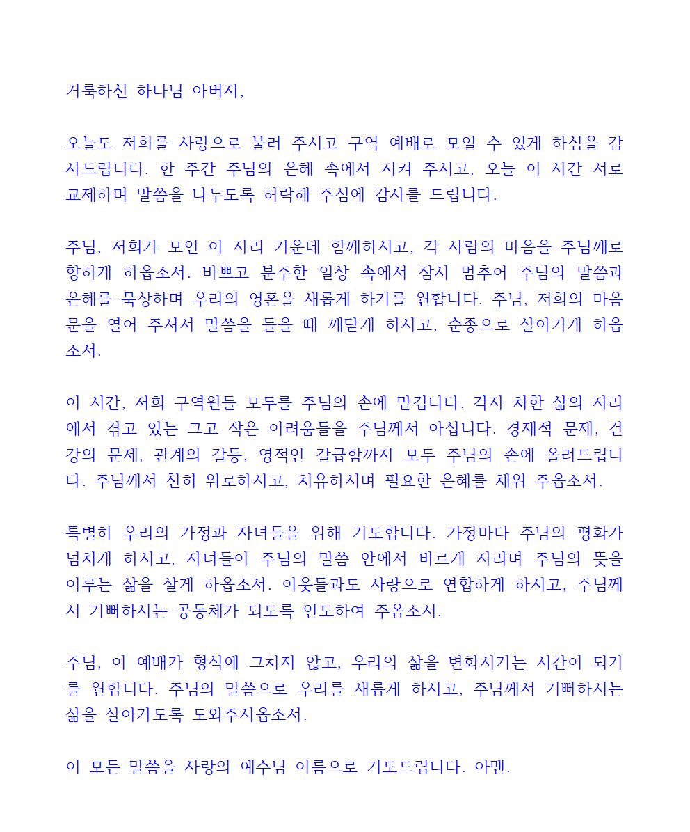 주님, 구역예배를 통해 저희가 더욱 주님을 사랑하게 하시고, 서로를 향한 사랑도 깊어지게 하옵소서. 이 모임을 통해 주님의 이름이 높아지고, 주님의 나라가 확장되며, 저희 모두가 주님께 기쁨이 되는 삶을 살아가게 하옵소서.
