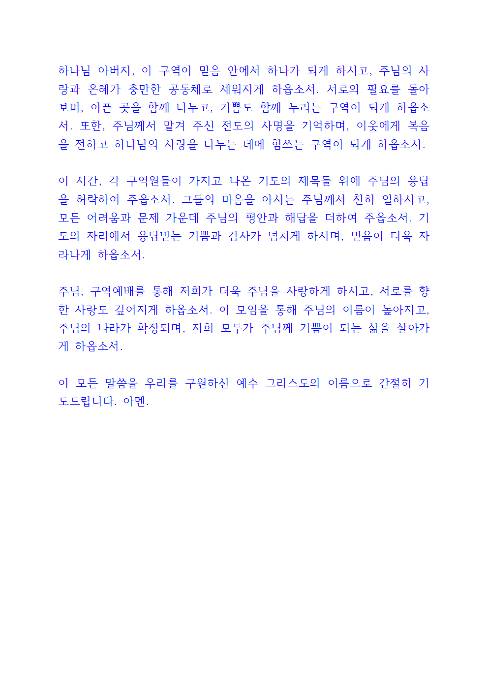 하나님 아버지, 이 구역이 믿음 안에서 하나가 되게 하시고, 주님의 사랑과 은혜가 충만한 공동체로 세워지게 하옵소서. 서로의 필요를 돌아보며, 아픈 곳을 함께 나누고, 기쁨도 함께 누리는 구역이 되게 하옵소서. 또한, 주님께서 맡겨 주신 전도의 사명을 기억하며, 이웃에게 복음을 전하고 하나님의 사랑을 나누는 데에 힘쓰는 구역이 되게 하옵소서.