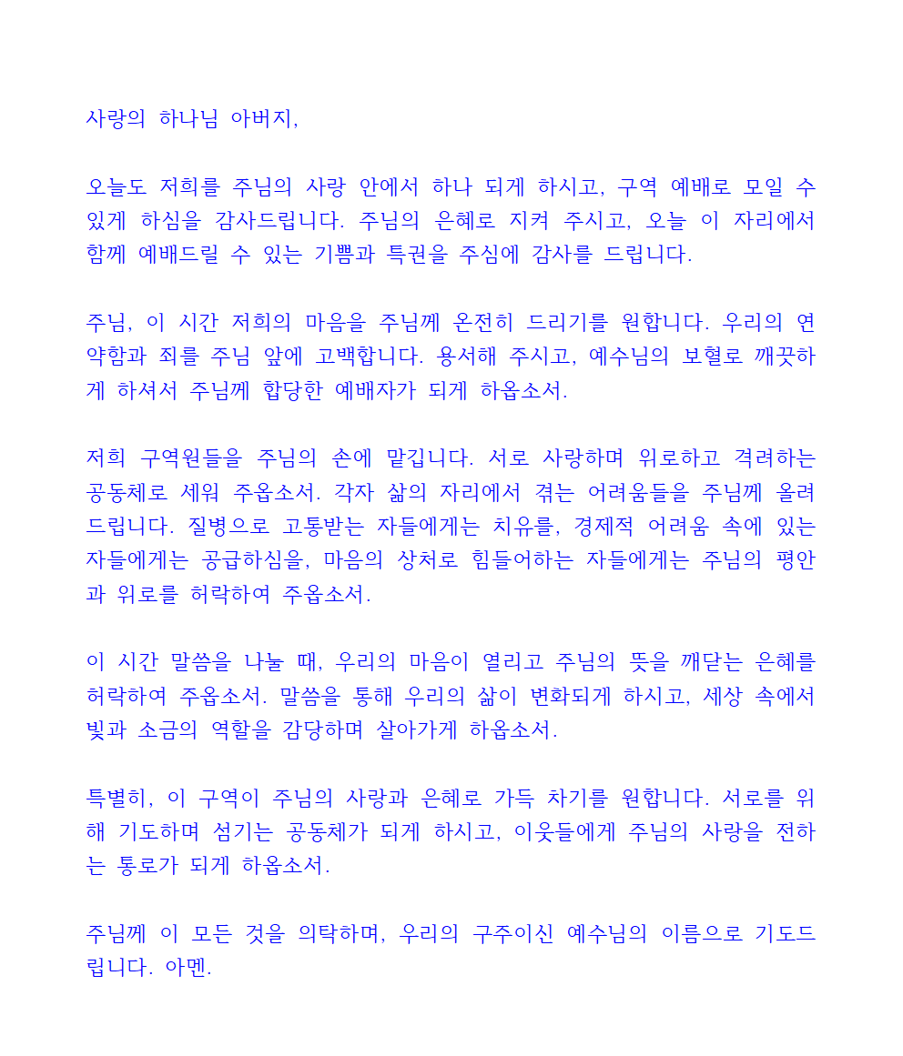 오늘 이렇게 귀한 구역예배로 저희를 한 자리에 모아 주심에 감사를 드립니다. 이 시간 저희가 한 마음으로 주님 앞에 나아가며 예배할 때, 주님께서 이 자리에 함께하여 주시고 우리의 찬양과 기도를 기쁘게 받아 주옵소서.