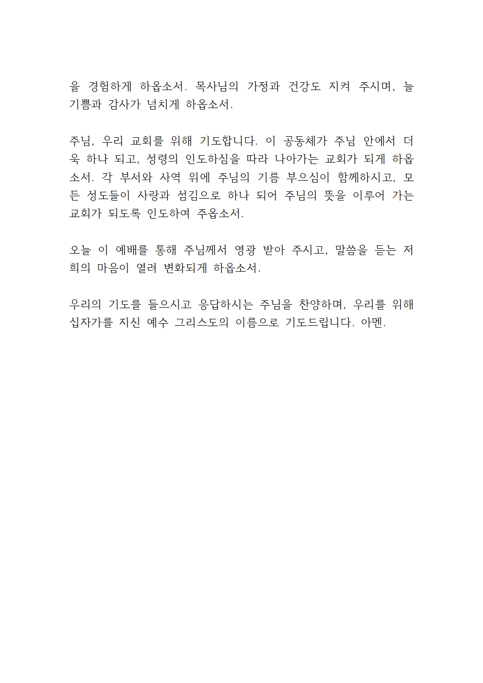 또한, 이 교회를 위해 기도합니다. 우리 교회를 세우신 주님, 주님의 몸 된 교회가 성령으로 충만하여, 세상의 빛과 소금의 역할을 감당하게 하시고, 복음의 능력을 나타내는 거룩한 공동체가 되게 하옵소서. 특별히 이 교회를 섬기시는 목사님을 위해 간절히 기도드립니다. 주님께서 능력의 손길로 붙드시고, 지치지 않도록 힘과 지혜를 더하여 주옵소서. 목사님의 사역이 더욱 풍성해지고, 영적 권세와 말씀의 능력이 충만하게 하옵소서. 모든 성도들이 목사님과 함께 교회를 세워 나가며, 서로를 사랑하고 섬기는 아름다운 공동체가 되도록 인도하여 주옵소서.