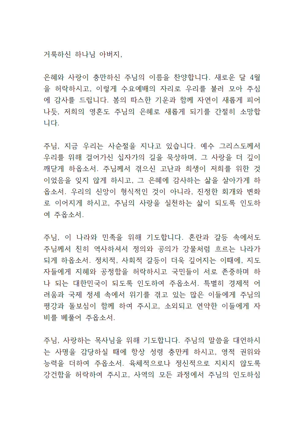 사순절 수요예배 대표기도문 내용