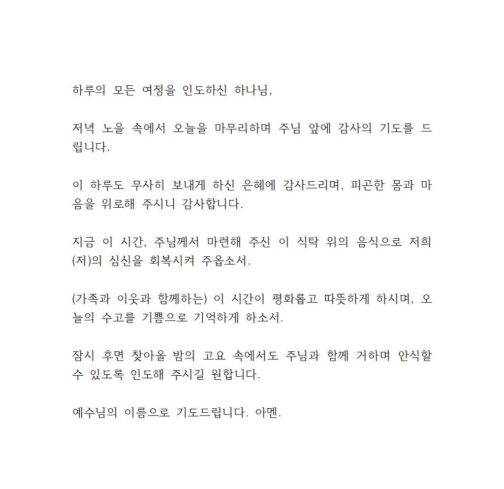 오늘 이렇게 정성껏 준비된 식탁 위에 주님의 손길이 머무르게 하시고, 이 음식이 우리 몸과 마음을 새롭게 하며, 우리의 교제를 더욱 깊게 하고 따뜻하게 하소서.