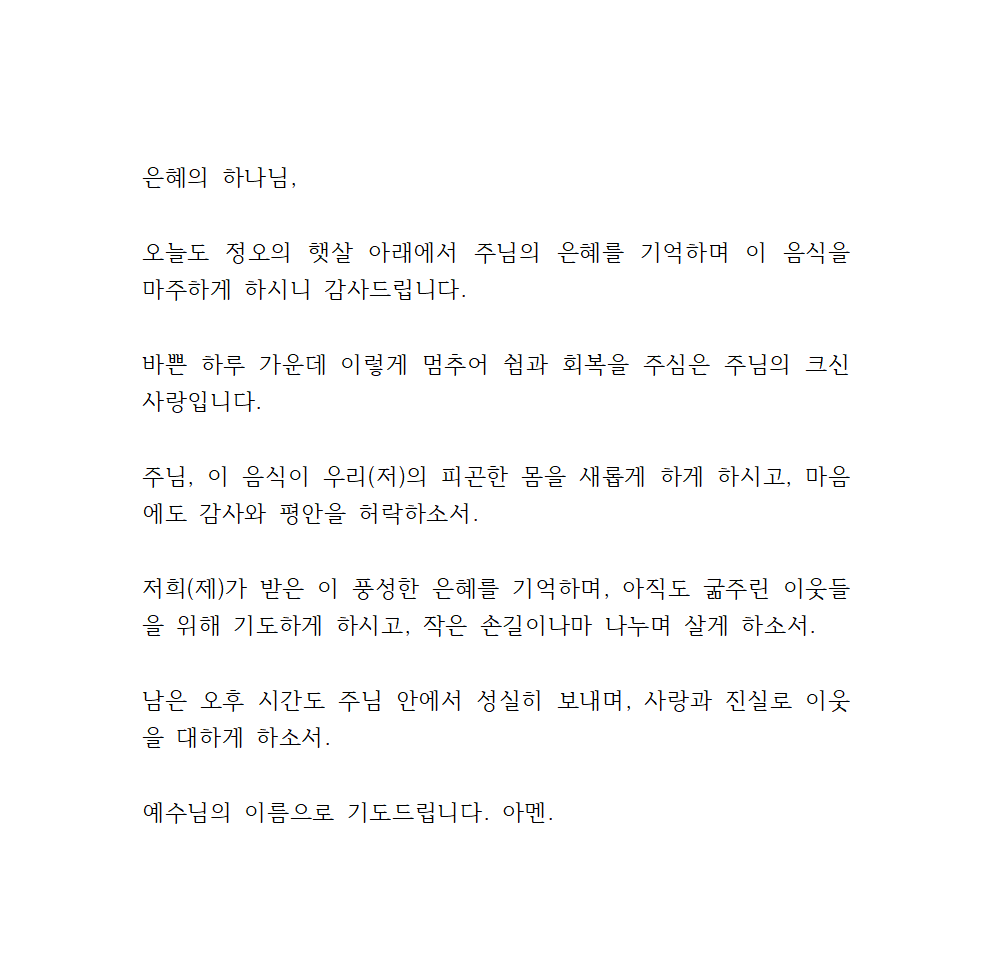 이 음식이 저희에게 힘이 되어 맡은 일을 기쁨으로 감당하게 하시고, 모든 순간 주님을 기억하며 살게 하소서.