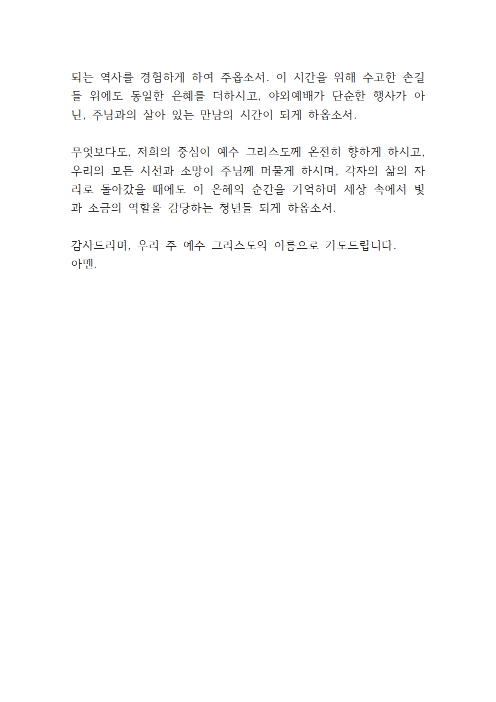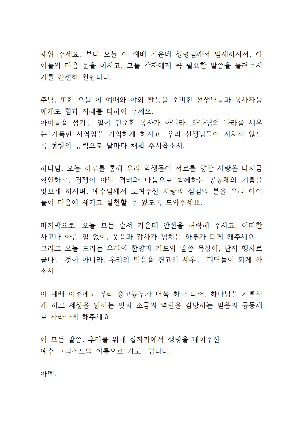 이 예배 이후에도 우리 중고등부가 더욱 하나 되어, 하나님을 기쁘시게 하고 세상을 밝히는 빛과 소금의 역할을 감당하는 믿음의 공동체로 자라나게 해 주세요.