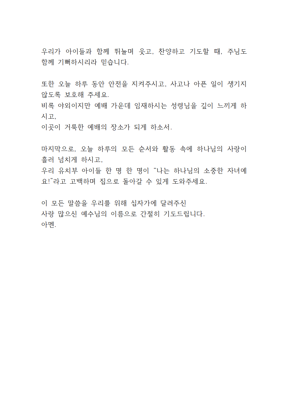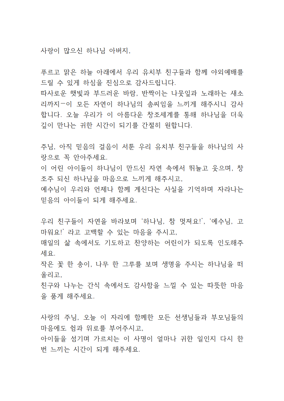 주님, 이 아이들이 스스로의 존재를 부정하거나, 비교 속에서 낙심하지 않게 하시고, 자신이 하나님의 형상대로 지음받은 존귀한 존재임을 기억하게 해 주세요. 오늘 이 야외예배가 단순한 나들이가 아니라, 이들의 삶에 하나님의 숨결이 스며드는 거룩한 시간이 되게 하시고, 이들이 다시금 주님 안에서 쉼을 얻고, 위로를 얻고, 정체성을 회복하는 시간이 되게 해 주세요.