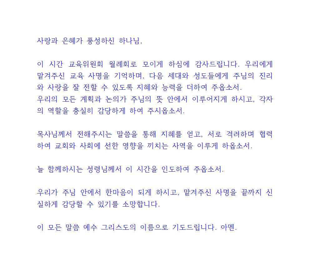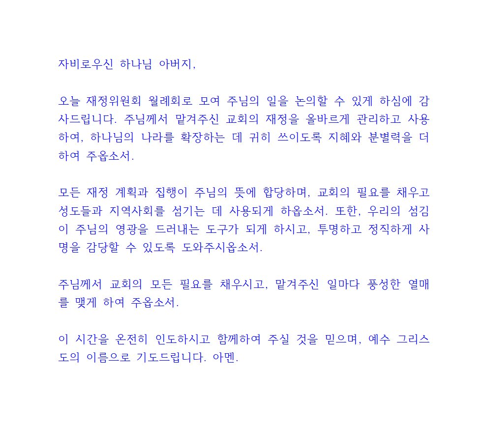이번 글에서는 위원회 월례회 기도문 모음(예배위원회, 교육위원회, 선교위원회, 재정위원회)을 안내해 드리겠습니다.