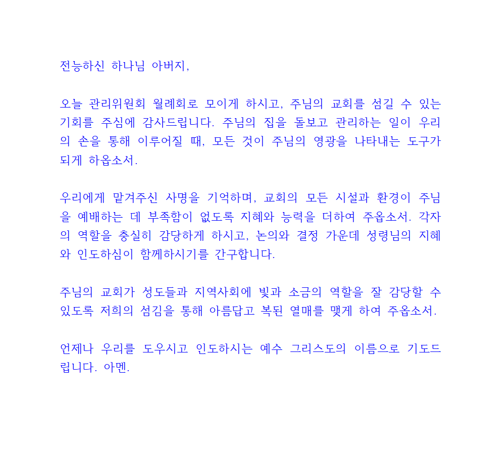 오늘 예배위원회 월례회로 한자리에 모이게 하심에 감사드립니다. 예배는 주님께 드리는 가장 귀한 헌신임을 기억하며, 저희 모두가 겸손한 마음으로 주님의 뜻에 순종하게 하여 주옵소서.