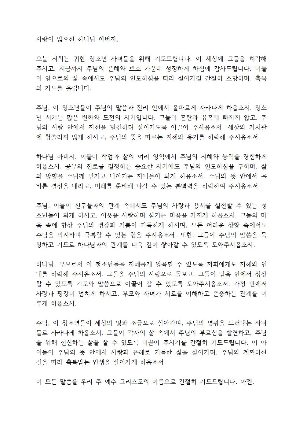 주님, 이 청소년들이 세상의 빛과 소금으로 살아가며, 주님의 영광을 드러내는 자녀들로 자라나게 하옵소서. 그들이 각자의 삶 속에서 주님의 부르심을 발견하고, 주님을 위해 헌신하는 삶을 살 수 있도록 이끌어 주시기를 간절히 기도드립니다. 이 아이들이 주님의 뜻 안에서 사랑과 은혜로 가득한 삶을 살아가며, 주님의 계획하신 길을 따라 축복받는 인생을 살아가게 하옵소서.