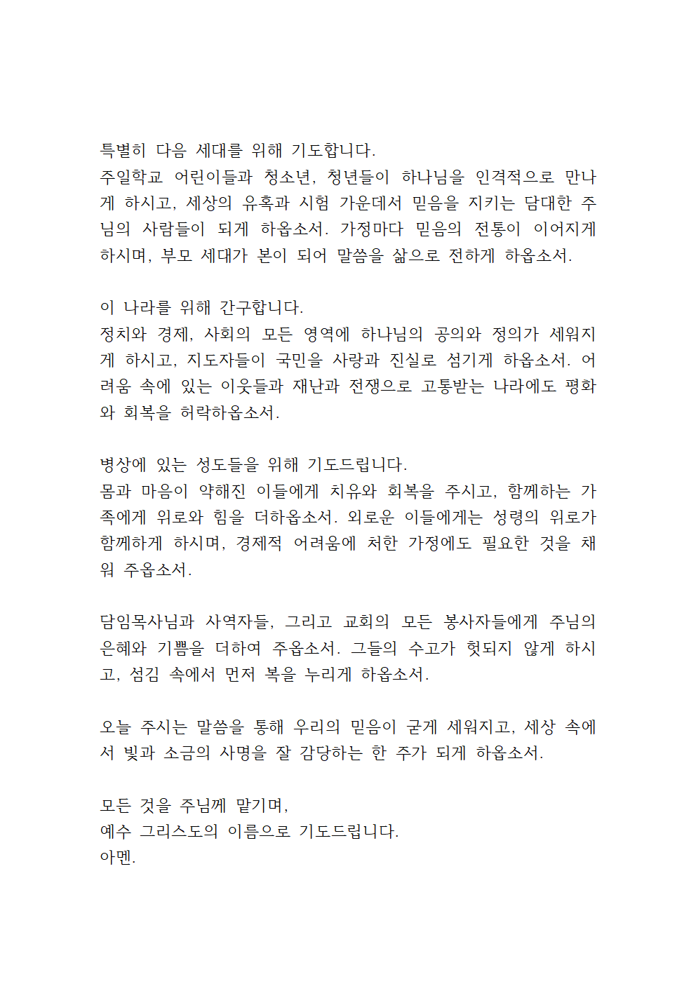 이제 말씀을 전하실 목사님께 성령의 충만함을 더하시어 그 입술을 통해 선포되는 말씀이 생명의 능력으로 나타나게 하옵소서. 그 말씀이 우리의 심령을 새롭게 하고, 가정과 교회와 사회 속에서 실천되는 삶으로 이어지게 하옵소서. 오늘 드리는 모든 찬양과 기도와 봉헌이 오직 하나님께 향한 향기로운 제물이 되게 하시고, 예배 전체를 통해 주님 홀로 영광 받아 주옵소서.