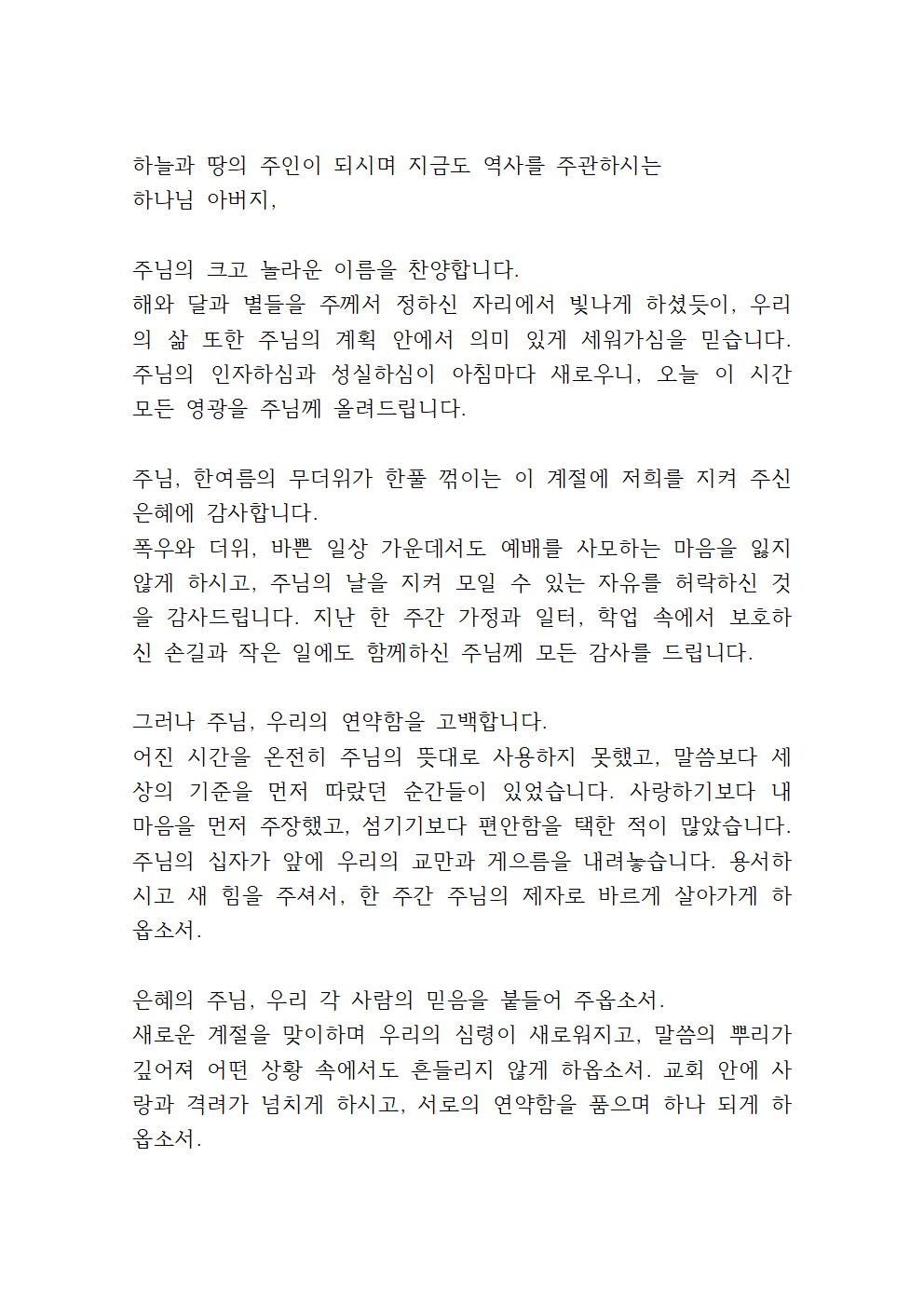 8월 다섯째주일 낮예배 대표기도문 1