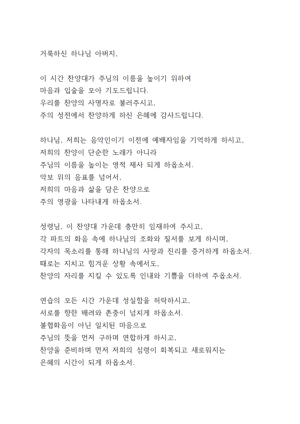주님, 이 시간 우리의 마음과 목소리를 온전히 주님께 드리며, 저희의 찬양이 주님께 기쁨이 되고, 주님의 영광을 높이는 도구로 사용되길 간절히 원합니다.