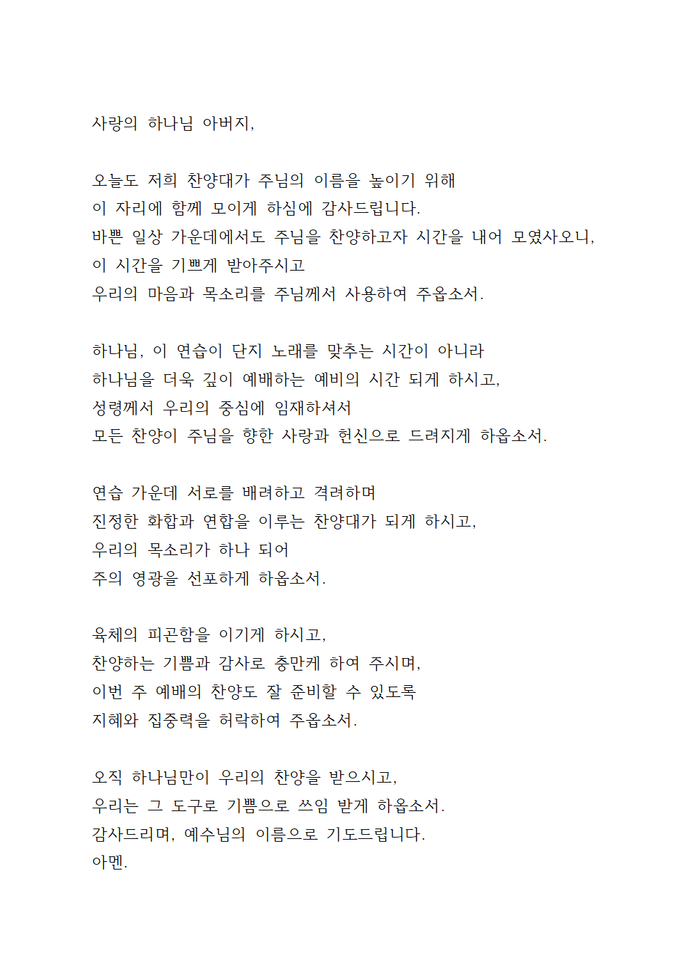 주님, 오늘 이 예배를 통해 저희 찬양대의 헌신이 주님께 상달되기를 원합니다. 찬양대원 모두가 주님의 크신 은혜와 사랑을 경험하며, 찬양을 드릴 때마다 주님의 임재를 느끼는 귀한 시간이 되게 하옵소서. 저희의 찬양을 통해 주님께서 영광 받으시고, 그 찬양을 듣는 이들이 주님을 만나고, 주님의 사랑을 느끼는 귀한 도구가 되게 하옵소서.