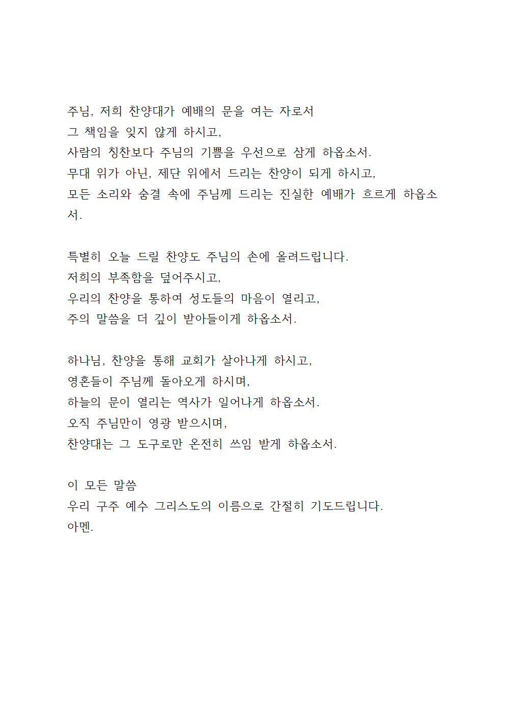 하나님 아버지, 찬양은 주님께 드리는 예배임을 고백합니다. 찬양을 통해 주님의 크신 사랑과 은혜가 회중 가운데 전달되게 하시고, 그 찬양을 듣는 모든 이들의 마음이 열려 주님의 임재를 경험하게 하옵소서.