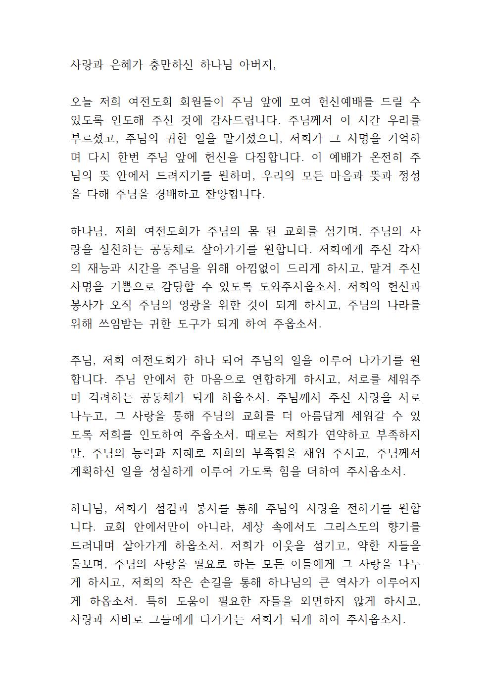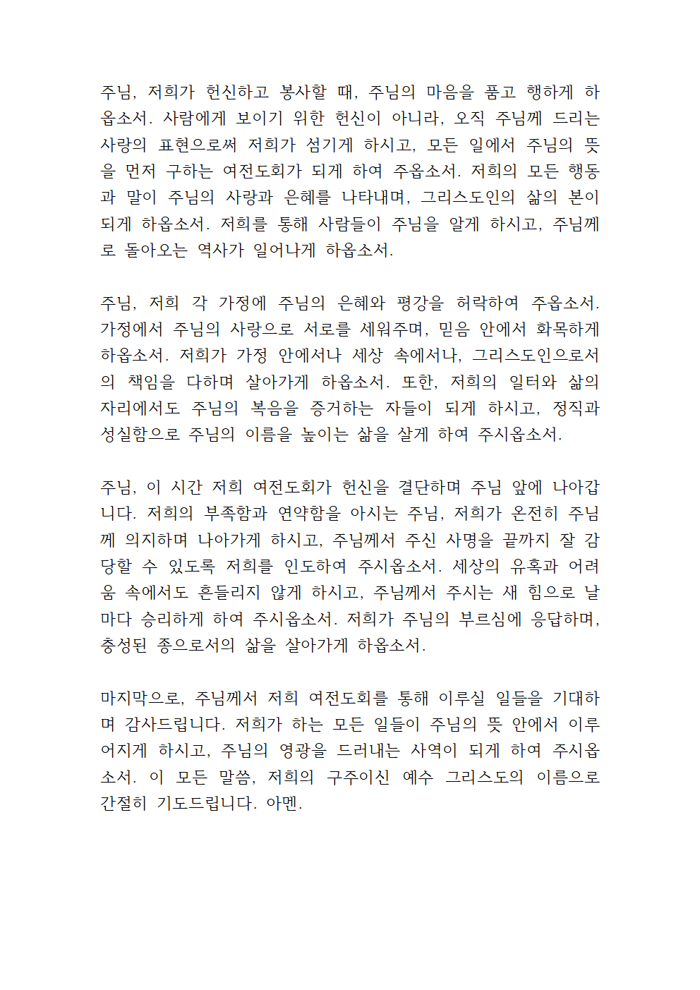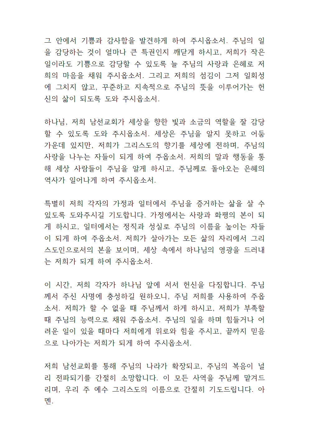 저희 남선교회가 주님의 뜻을 이루기 위해 함께 모여 기도하고, 섬기며, 봉사할 때, 성령님의 인도하심으로 모든 일들이 주님의 영광을 드러내는 일이 되게 하여 주옵소서. 저희가 무슨 일을 하든지 인간적인 욕심이나 자랑이 아닌, 오직 주님만을 바라보고, 주님만을 높이며 나아가게 하여 주시옵소서. 세상의 소리에 귀를 기울이기보다는 주님의 말씀에 귀를 기울이며, 그 말씀을 따라 순종하는 남선교회가 되게 하여 주시옵소서.