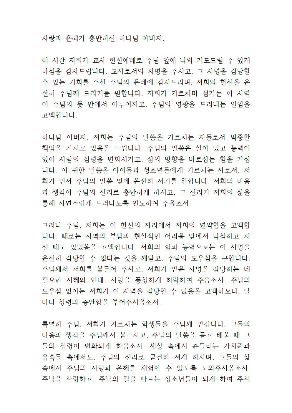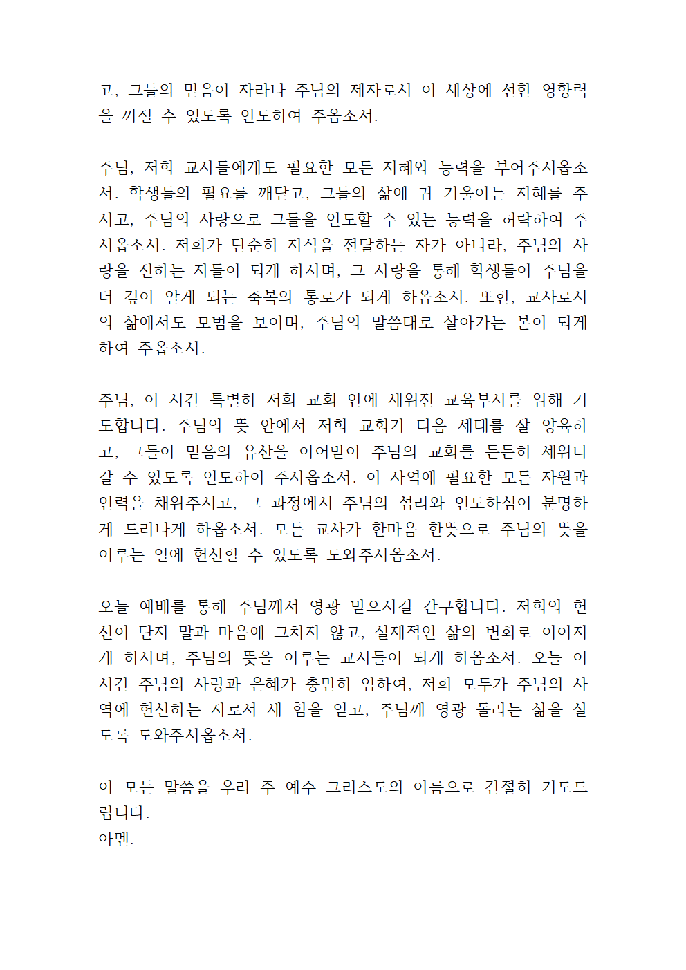 특별히 저희 각자의 가정과 일터에서 주님을 증거하는 삶을 살 수 있도록 도와주시길 기도합니다. 가정에서는 사랑과 화평의 본이 되게 하시고, 일터에서는 정직과 성실로 주님의 이름을 높이는 자들이 되게 하여 주옵소서. 저희가 살아가는 모든 삶의 자리에서 그리스도인으로서의 본을 보이며, 세상 속에서 하나님의 영광을 드러내는 저희가 되게 하여 주시옵소서.