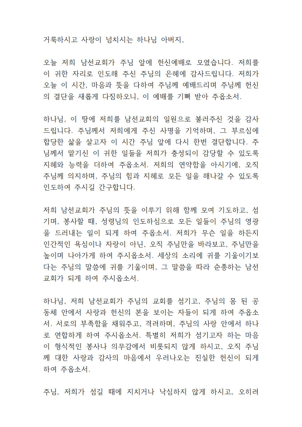 하나님, 저희 남선교회가 주님의 교회를 섬기고, 주님의 몸 된 공동체 안에서 사랑과 헌신의 본을 보이는 자들이 되게 하여 주옵소서. 서로의 부족함을 채워주고, 격려하며, 주님의 사랑 안에서 하나로 연합하게 하여 주시옵소서. 특별히 저희가 섬기고자 하는 마음이 형식적인 봉사나 의무감에서 비롯되지 않게 하시고, 오직 주님께 대한 사랑과 감사의 마음에서 우러나오는 진실한 헌신이 되게 하여 주옵소서.