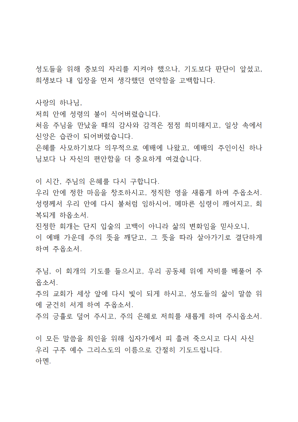 하나님, 이 시간 주님 앞에 머리 숙여 회개하오니, 예수 그리스도의 보혈로 우리의 죄를 깨끗하게 씻어 주시고, 상한 심령을 새롭게 하여 주옵소서. 우리를 정결하게 하사, 주님의 말씀을 바로 듣게 하시고, 마음과 뜻과 힘을 다하여 주를 예배하는 백성 되게 하소서.