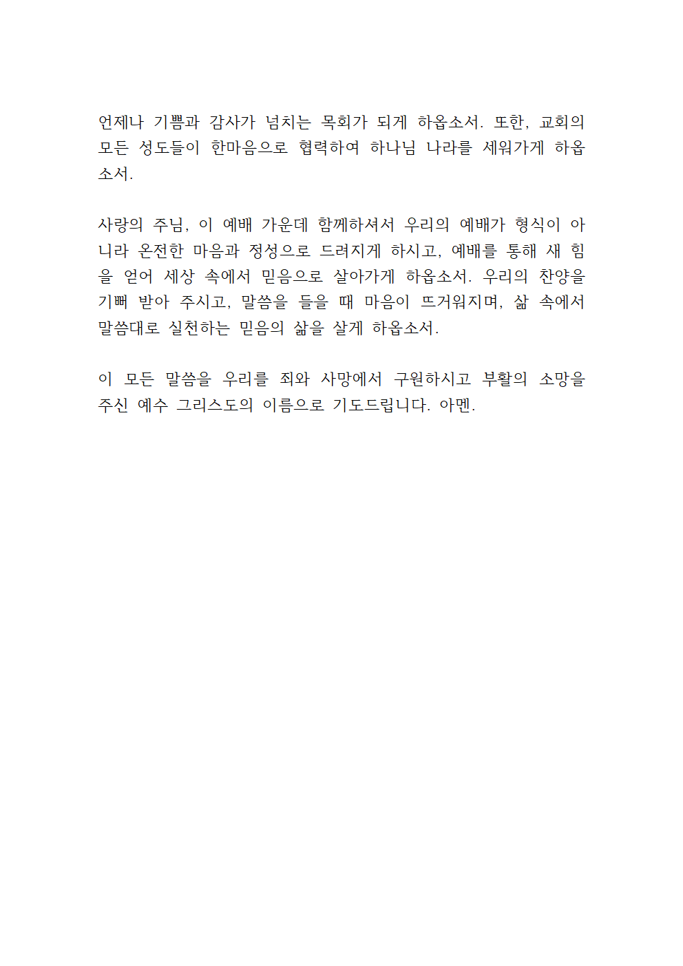 사랑의 주님, 이 예배 가운데 함께하셔서 우리의 예배가 형식이 아니라 온전한 마음과 정성으로 드려지게 하시고, 예배를 통해 새 힘을 얻어 세상 속에서 믿음으로 살아가게 하옵소서. 우리의 찬양을 기뻐 받아 주시고, 말씀을 들을 때 마음이 뜨거워지며, 삶 속에서 말씀대로 실천하는 믿음의 삶을 살게 하옵소서.