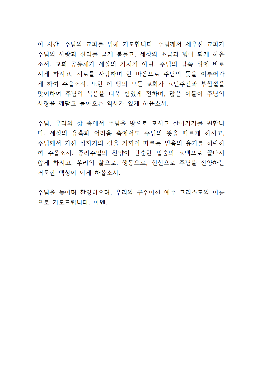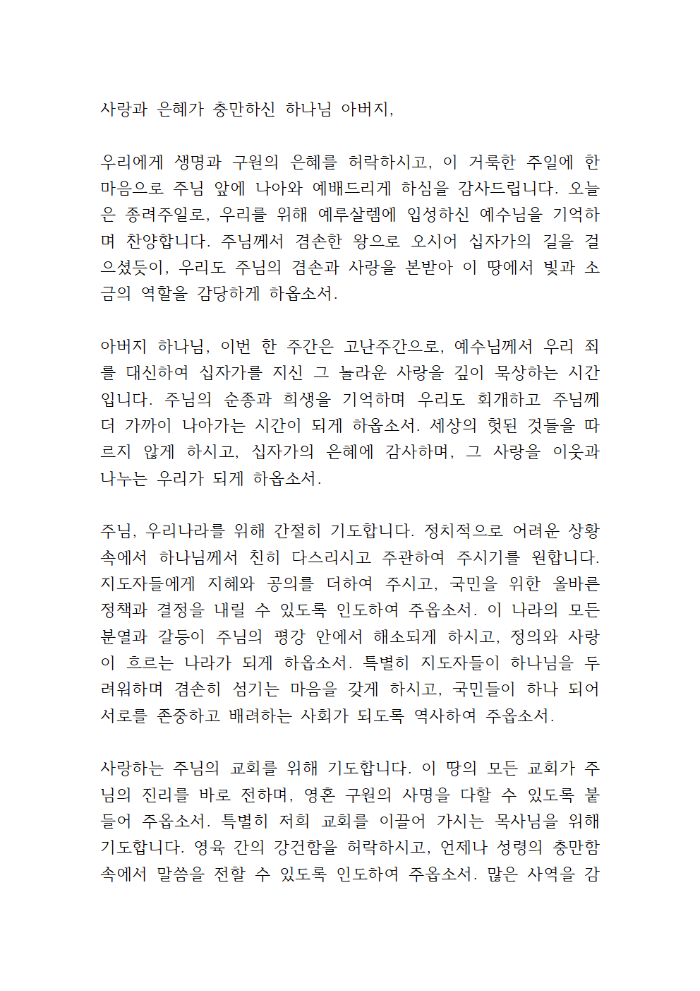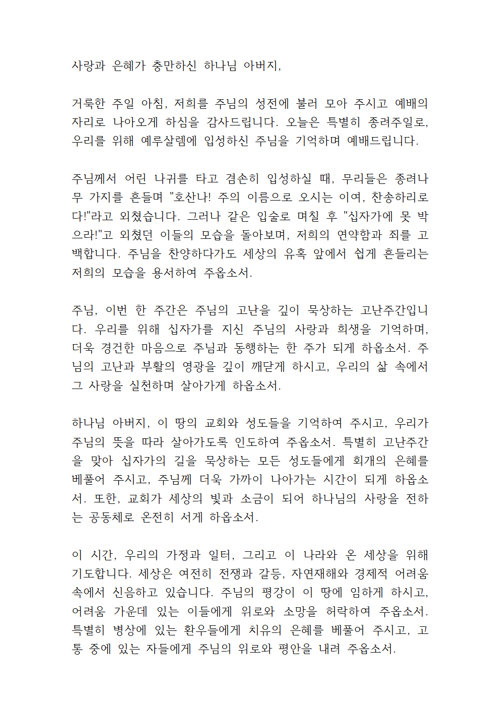 하나님 아버지, 이 땅의 교회와 성도들을 기억하여 주시고, 우리가 주님의 뜻을 따라 살아가도록 인도하여 주옵소서. 특별히 고난주간을 맞아 십자가의 길을 묵상하는 모든 성도들에게 회개의 은혜를 베풀어 주시고, 주님께 더욱 가까이 나아가는 시간이 되게 하옵소서. 또한, 교회가 세상의 빛과 소금이 되어 하나님의 사랑을 전하는 공동체로 온전히 서게 하옵소서.