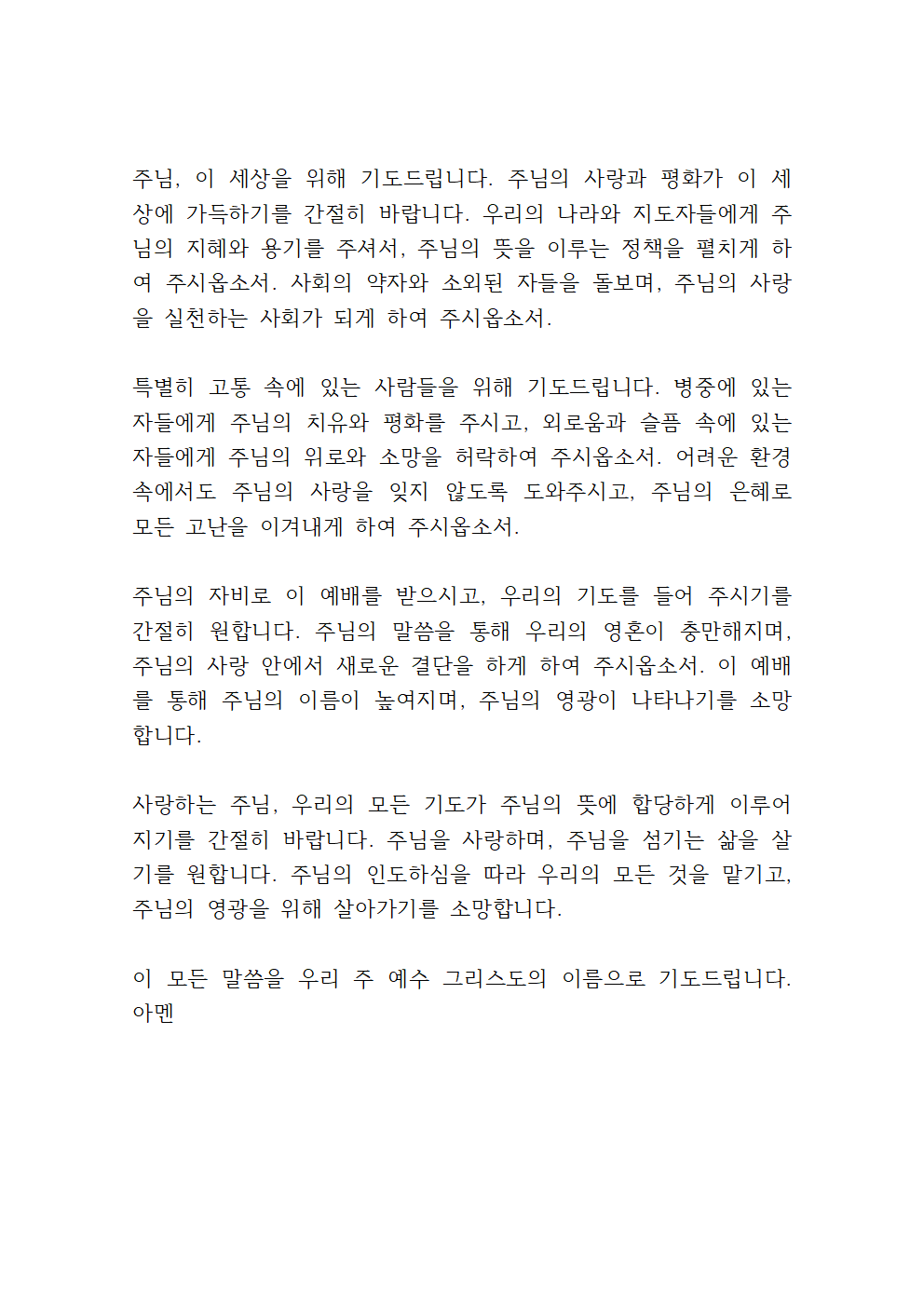 아버지 하나님, 이 나라와 민족을 위해 기도드립니다. 우리나라를 정의와 사랑이 흐르는 땅으로 인도하여 주시고, 지도자들에게 지혜와 바른 결단력을 허락하셔서 국민들을 위해 공의롭게 통치하게 하옵소서. 또한 세계 곳곳에서 전쟁과 분쟁으로 고통받는 이들을 주님께서 위로하여 주시고, 평화와 화해가 이루어질 수 있도록 역사하여 주옵소서.