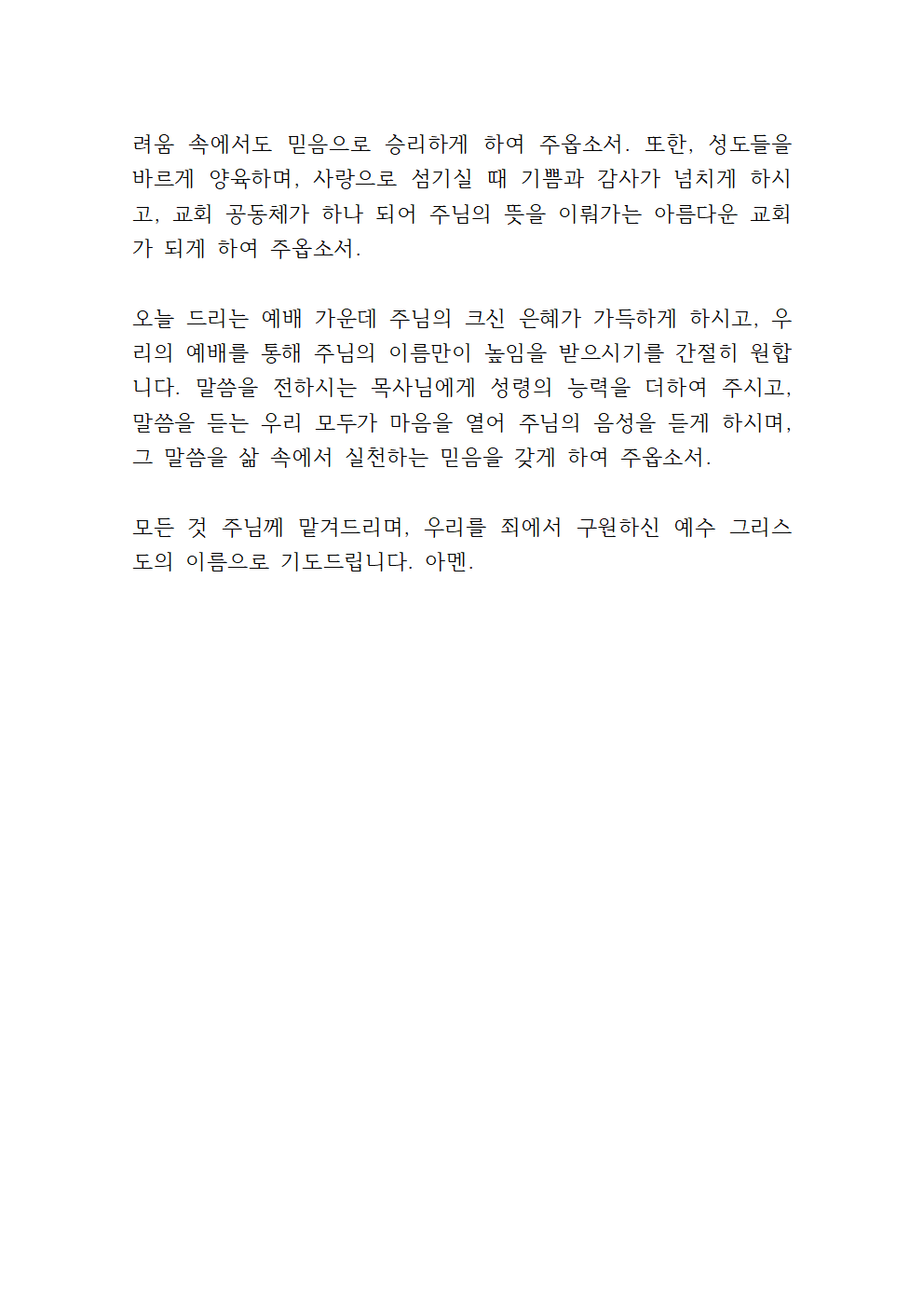 이 예배를 통해 주님 홀로 영광 받으시고, 우리의 찬양과 기도가 주님의 기쁨이 되게 하옵소서. 말씀을 선포하시는 목사님께 성령의 기름 부으심을 허락하셔서, 주님의 진리가 선포될 때 우리의 마음이 변화되고 새롭게 되는 역사가 일어나게 하옵소서.