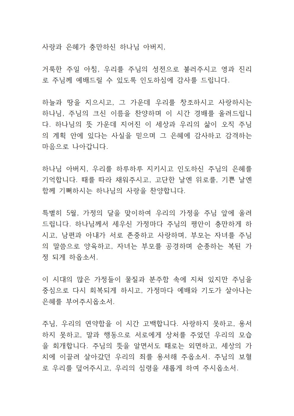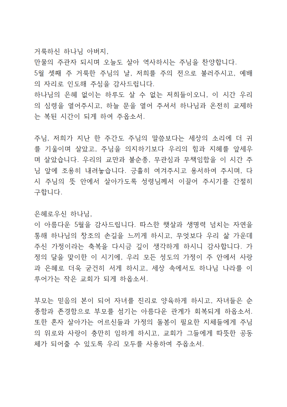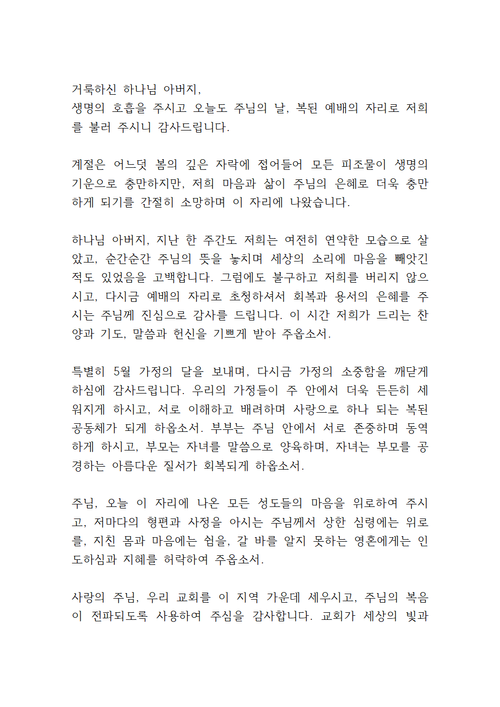 따라서, 이번 기도에서는 가정의 달을 맞이한 주일예배 기도의 근간을 잘 지키되 한국 정치의 안정과 대선을 위한 기도를 포함되면 더 좋을 것 같습니다.