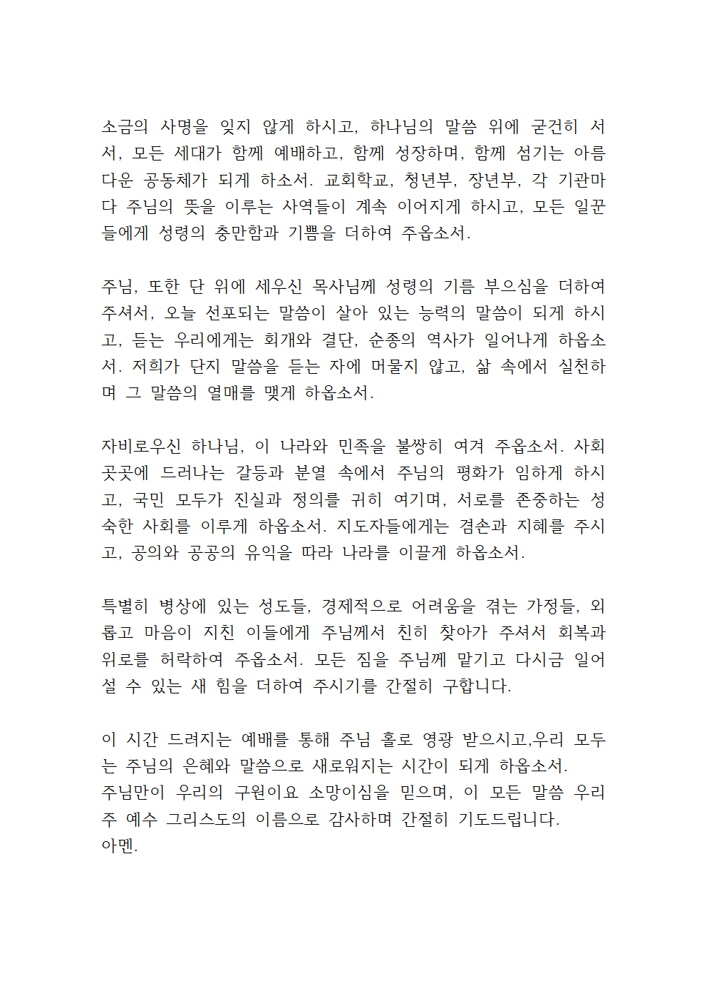 하나님, 이 땅의 교회들이 복음의 빛을 잃지 않게 하시고, 우리 교회 또한 주님의 말씀을 삶으로 실천하는 공동체 되게 하소서. 가정마다 기도가 살아나게 하시고, 세대 간의 믿음이 이어지게 하시며, 사랑과 화평이 넘치는 교회로 사용하여 주옵소서.
