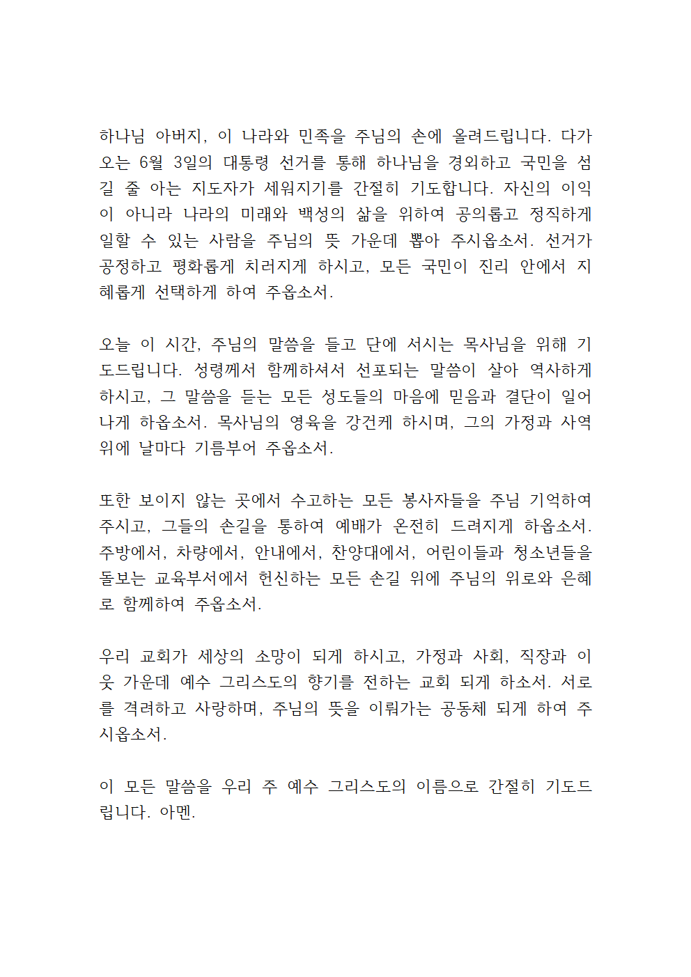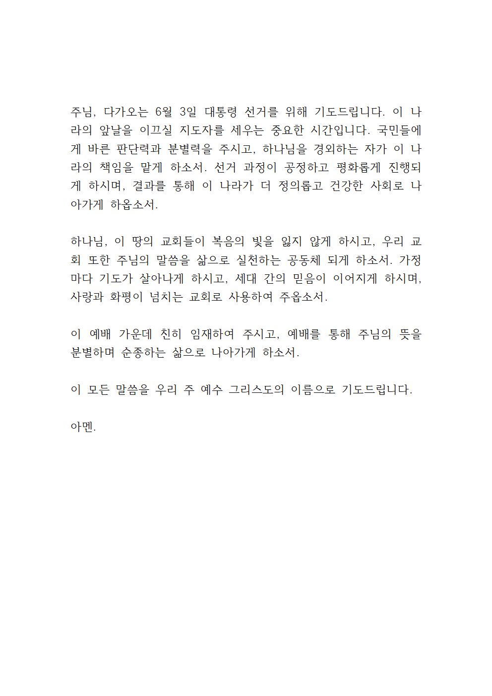 주님, 다가오는 6월 3일 대통령 선거를 위해 기도드립니다. 이 나라의 앞날을 이끄실 지도자를 세우는 중요한 시간입니다. 국민들에게 바른 판단력과 분별력을 주시고, 하나님을 경외하는 자가 이 나라의 책임을 맡게 하소서. 선거 과정이 공정하고 평화롭게 진행되게 하시며, 결과를 통해 이 나라가 더 정의롭고 건강한 사회로 나아가게 하옵소서.