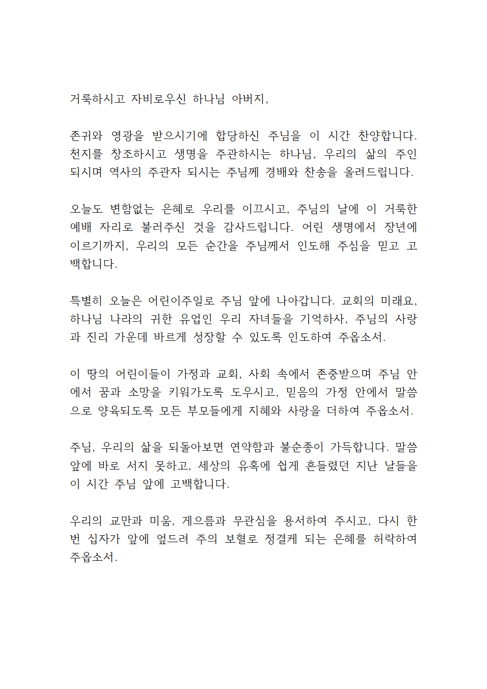 오늘도 변함없는 은혜로 우리를 이끄시고, 주님의 날에 이 거룩한 예배 자리로 불러주신 것을 감사드립니다. 어린 생명에서 장년에 이르기까지, 우리의 모든 순간을 주님께서 인도해 주심을 믿고 고백합니다.