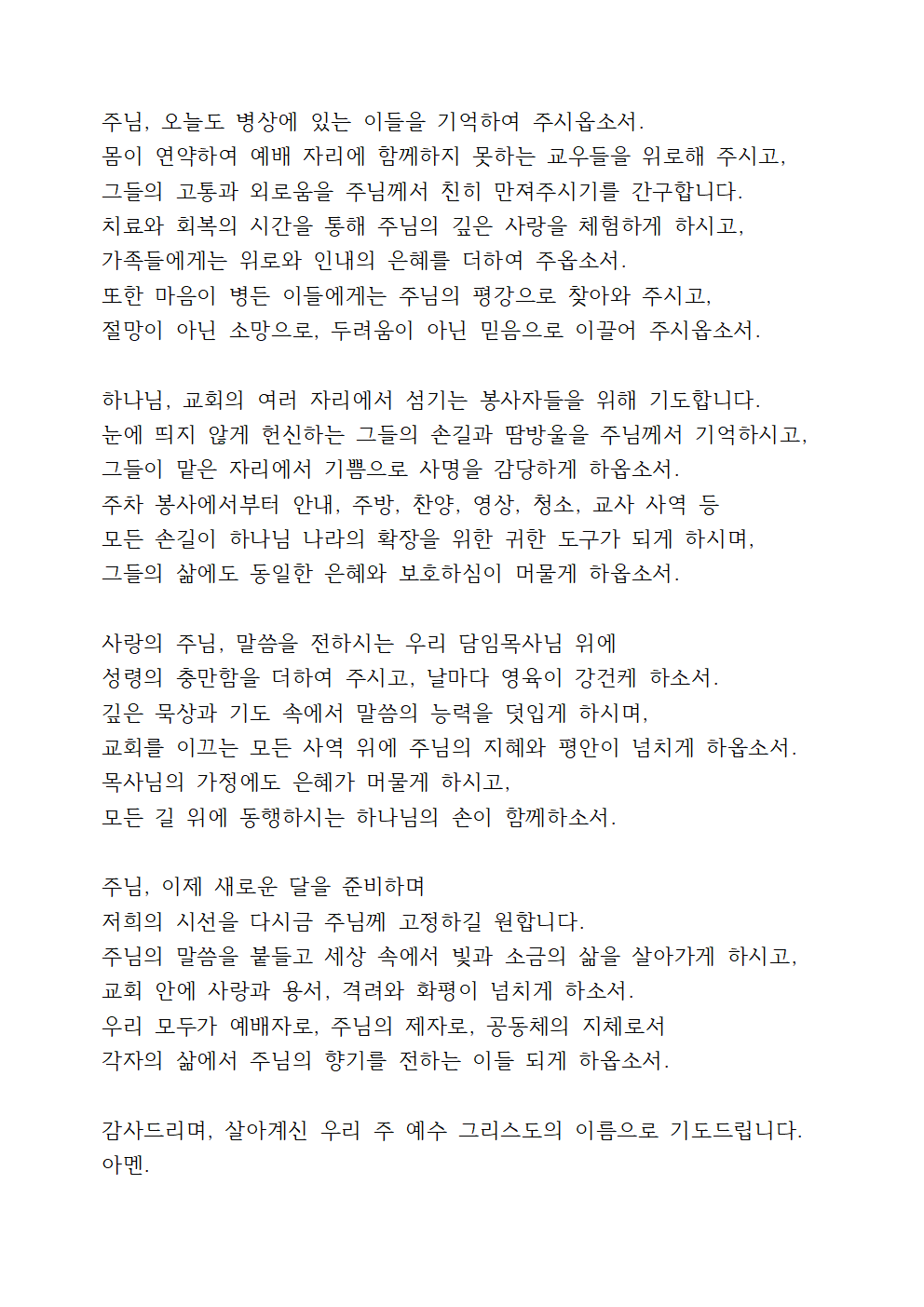자비로우신 주님, 저희 교회가 지역사회의 등불이 되게 하시고, 세상을 향해 복음의 빛을 전하는 믿음의 공동체가 되게 하옵소서. 모든 성도가 말씀과 기도에 힘쓰며, 삶 속에서 주님의 향기를 드러내는 참된 제자로 살아가게 하시고, 서로를 격려하며 사랑 안에서 하나 되어 하나님 나라를 이루어가는 교회 되게 하옵소서.