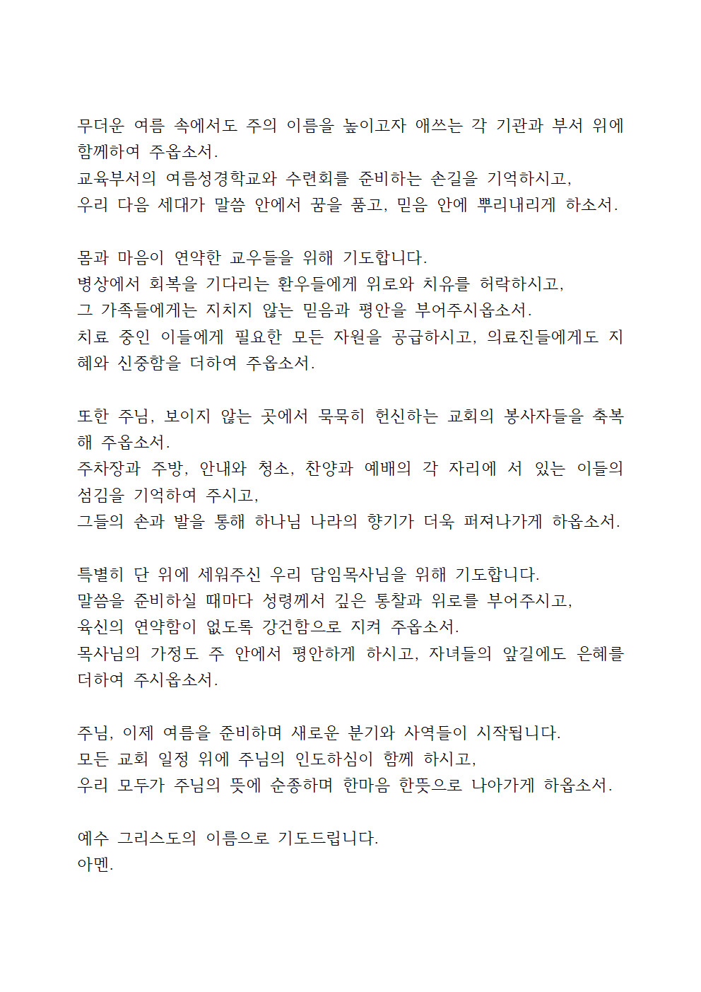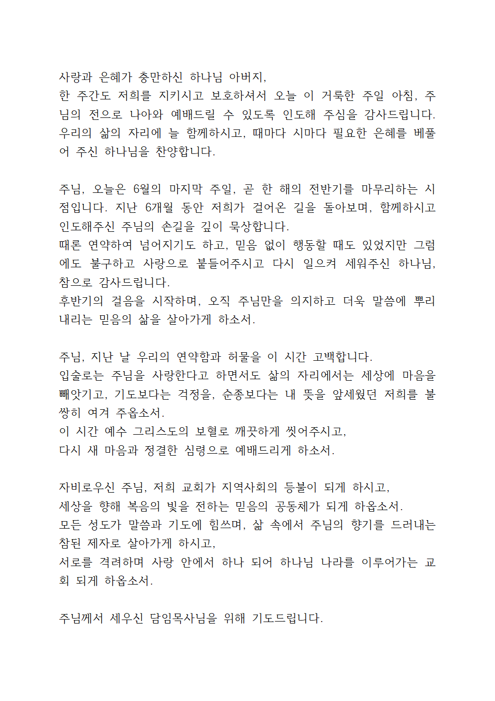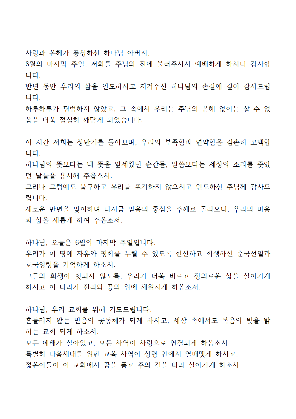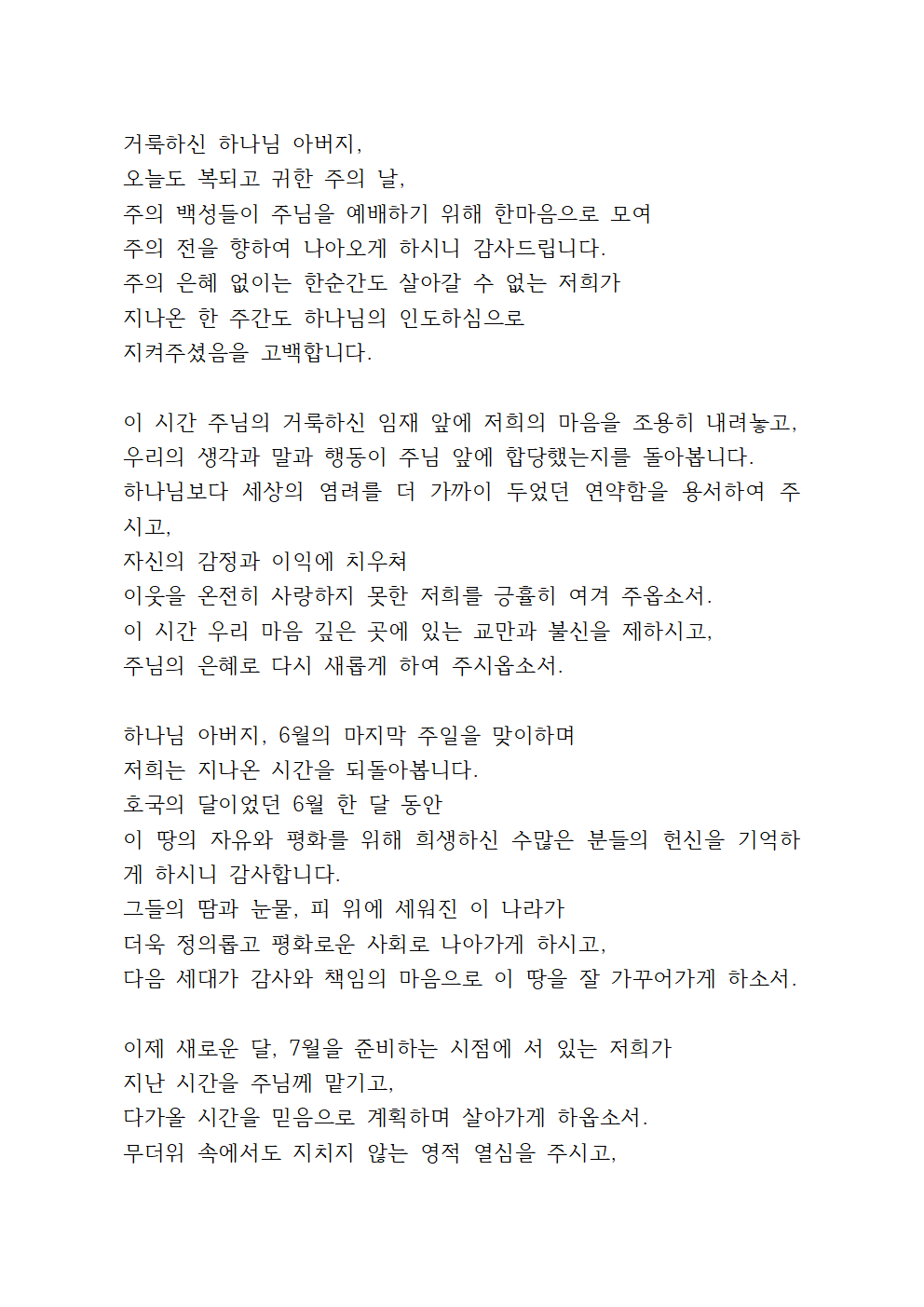 6월 다섯째 주일낮예배 대표기도문 BEST 2