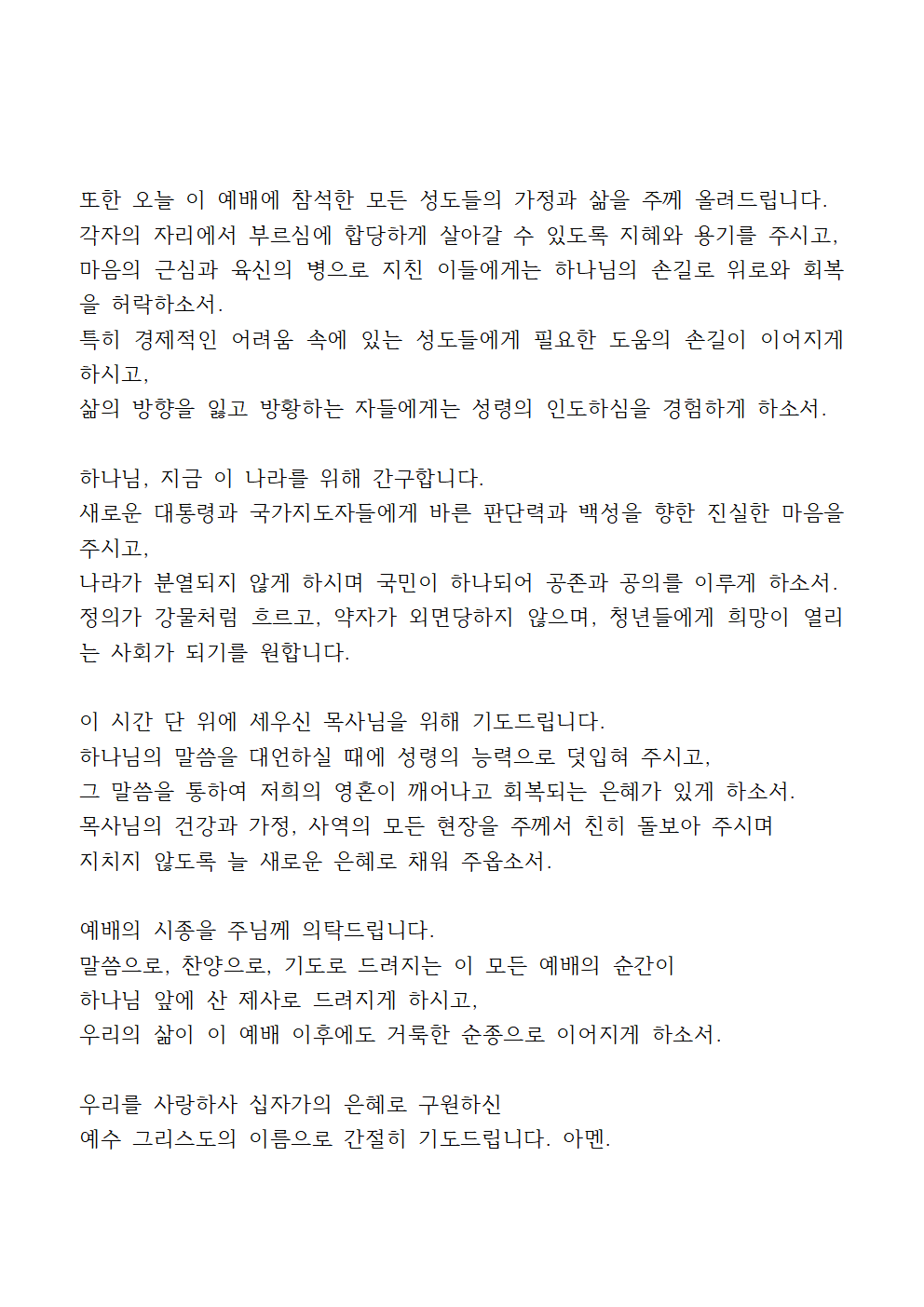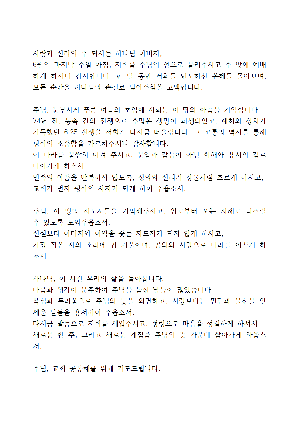 6월 다섯째 주일 낮예배 기도에서는