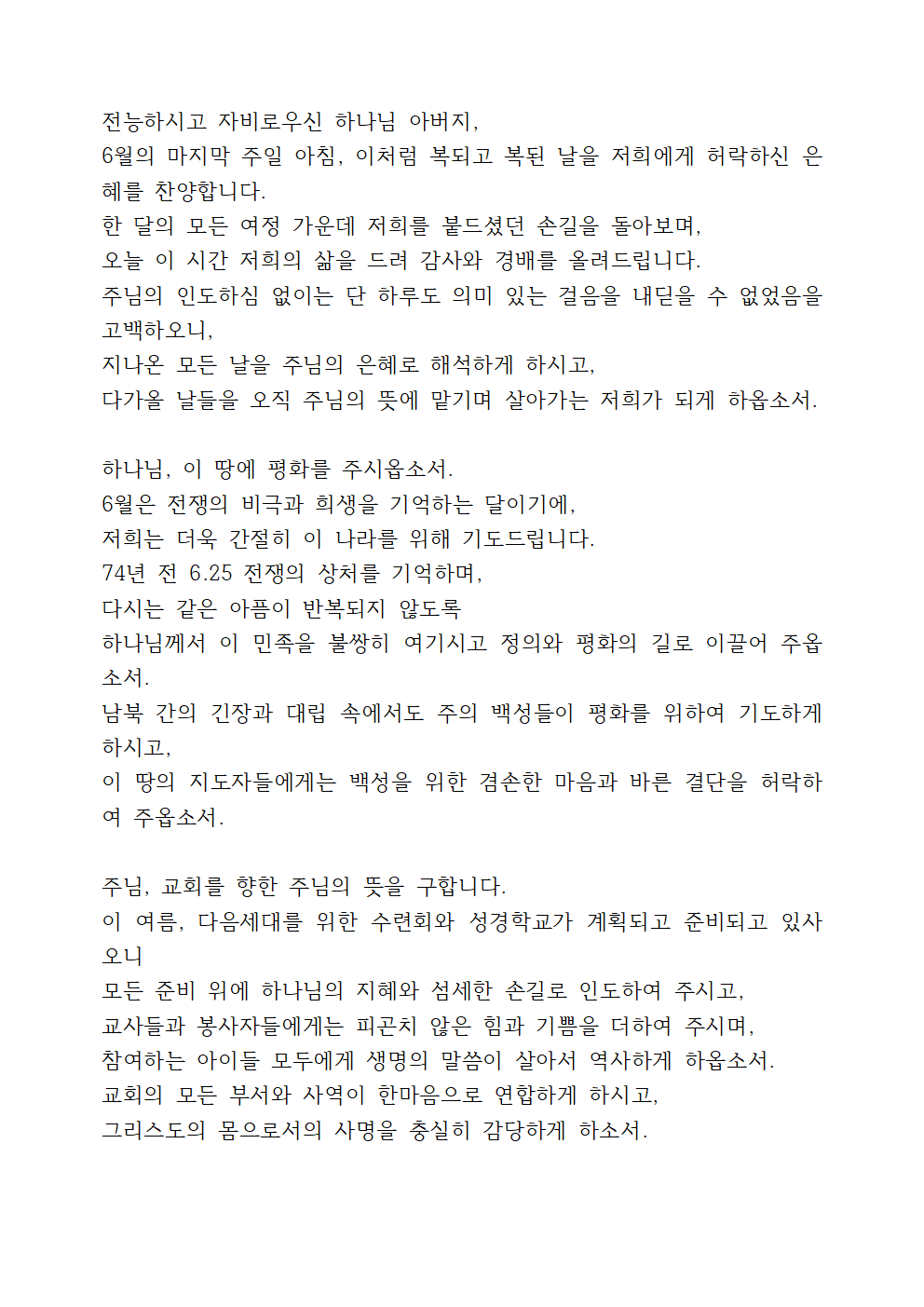 호국의 달 6월을 인도해 주신 하나님께 감사를 드리고, 곧 다가올 교회의 여름 사역을 위해 기도하면 좋을 것입니다.