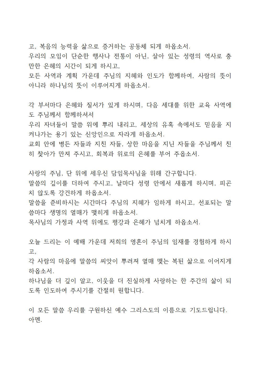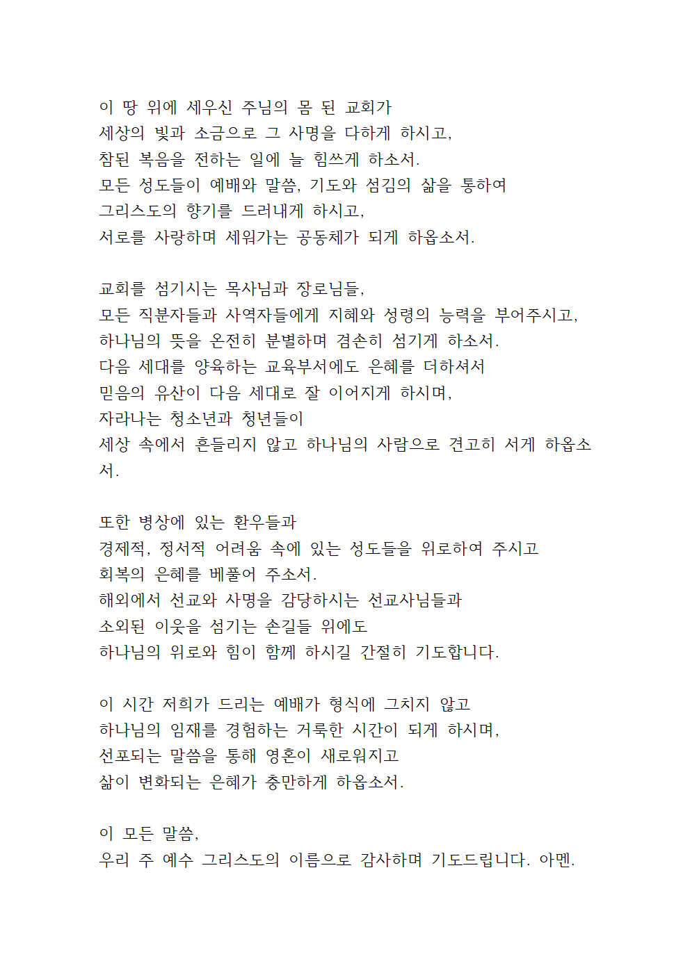 하나님, 교회를 위하여 기도합니다. 주님께서 핏값으로 세우신 이 교회가 세상 속에 거룩한 등불이 되게 하시고, 복음의 능력을 삶으로 증거하는 공동체 되게 하옵소서. 우리의 모임이 단순한 행사나 전통이 아닌, 살아 있는 성령의 역사로 충만한 은혜의 시간이 되게 하시고, 모든 사역과 계획 가운데 주님의 지혜와 인도가 함께하여, 사람의 뜻이 아니라 하나님의 뜻이 이루어지게 하옵소서.