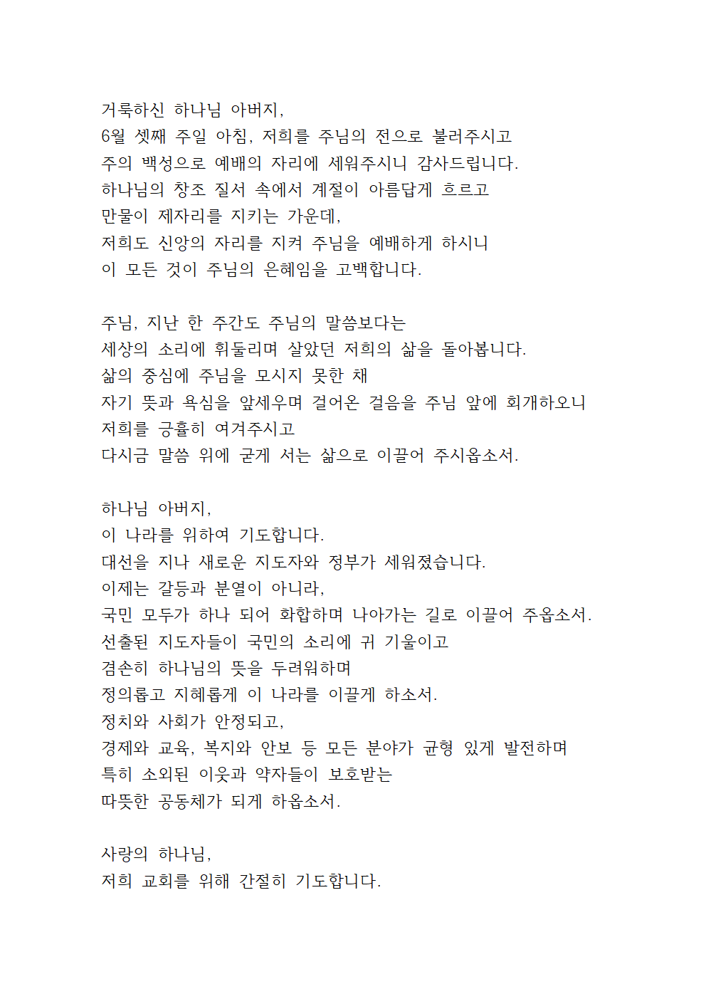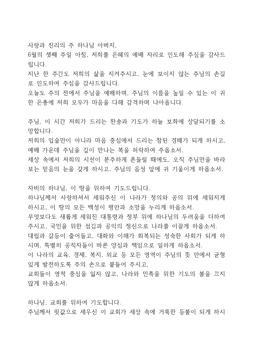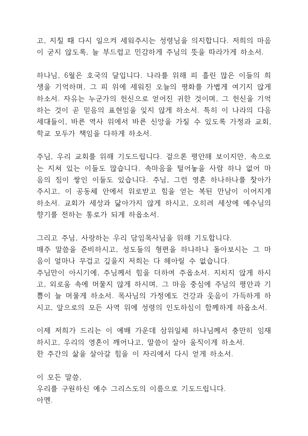 6월 셋째 주일낮예배 대표기도문 BEST 2