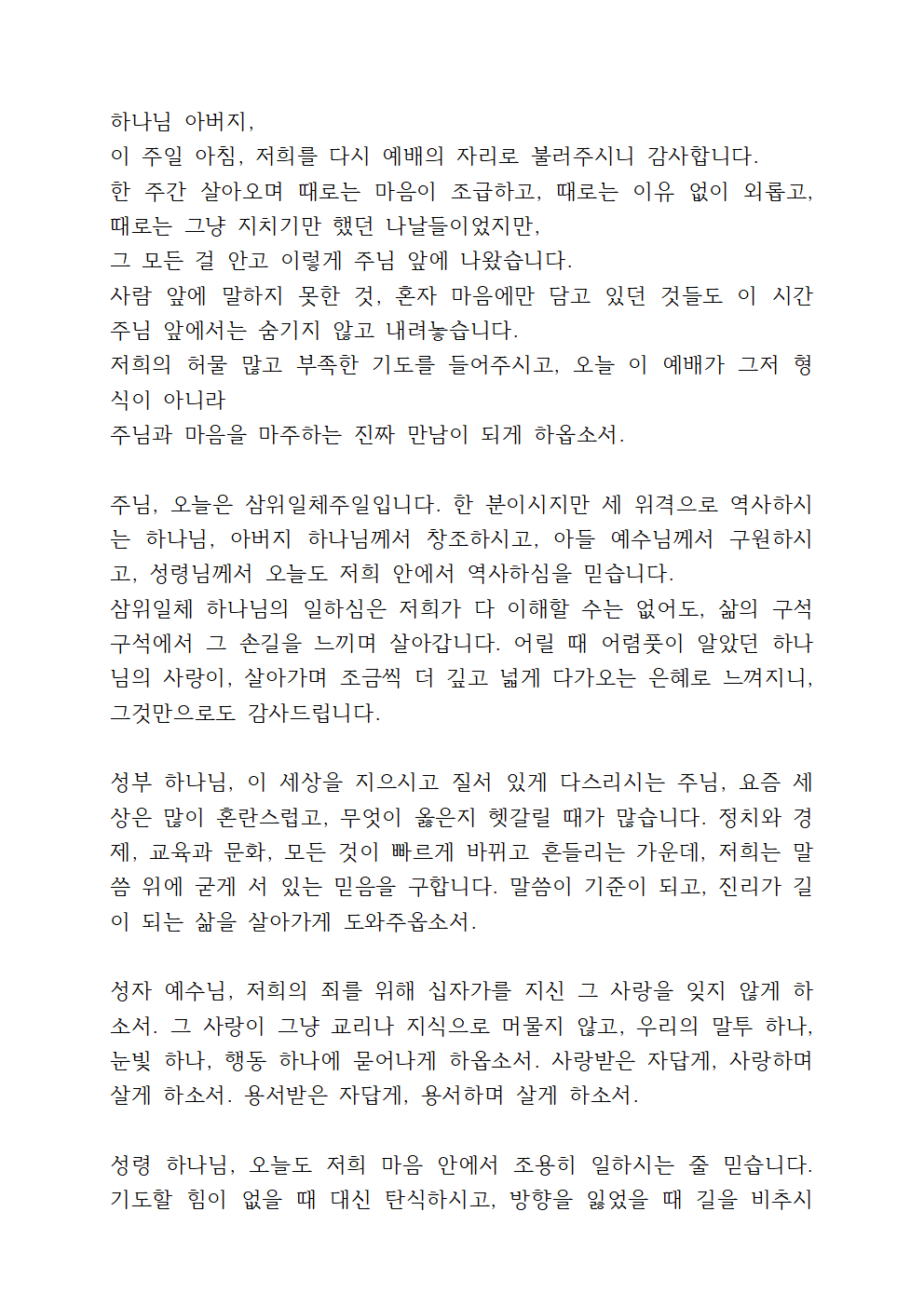 오늘 드리는 이 예배 가운데 저희의 영혼이 주님의 임재를 경험하게 하시고, 각 사람의 마음에 말씀의 씨앗이 뿌려져 열매 맺는 복된 삶으로 이어지게 하옵소서. 하나님을 더 깊이 알고, 이웃을 더 진실하게 사랑하는 한 주간의 삶이 되도록 인도하여 주시기를 간절히 원합니다.