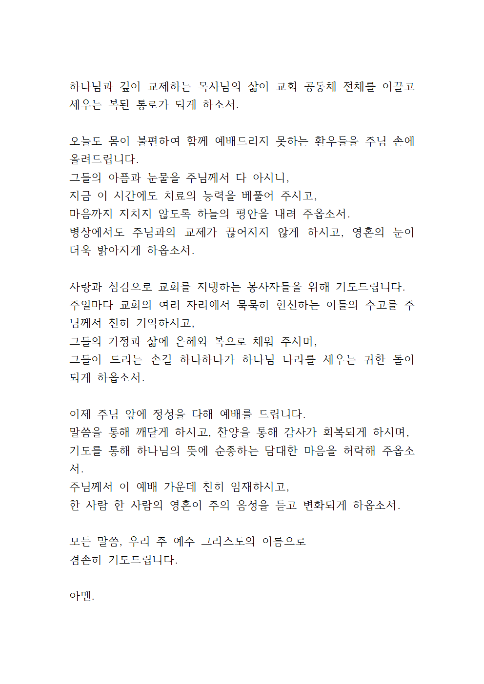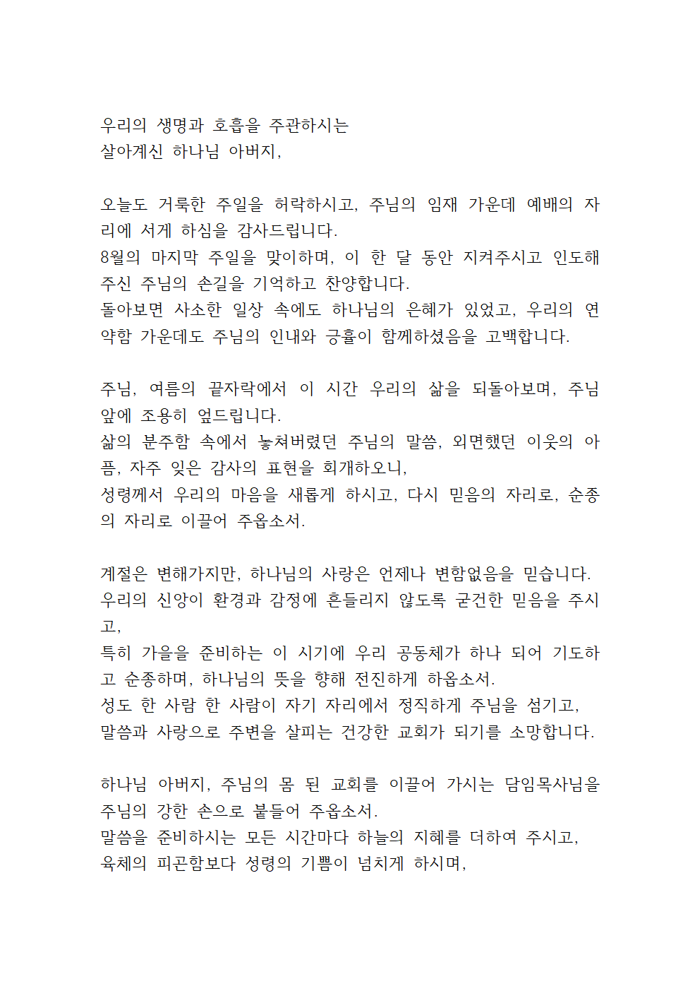 이번 글에서는 8월 다섯째주일 낮예배 대표기도문을 안내해 드리겠습니다.