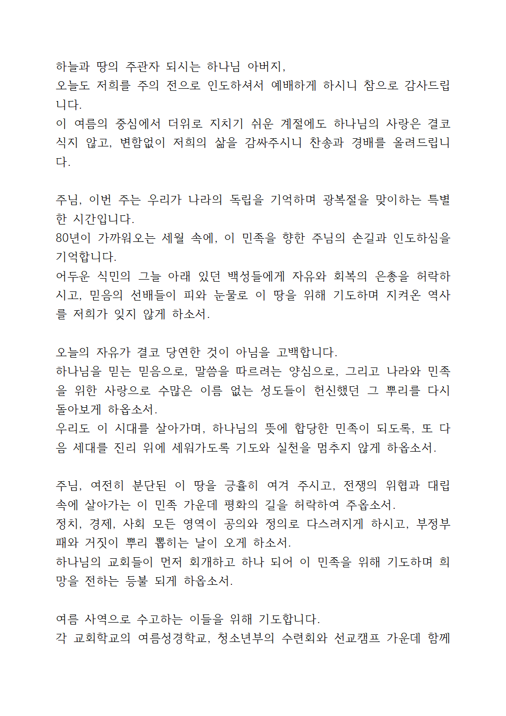 광복의 은혜를 기억하는 이 8월, 이 땅에 자유를 허락하신 주님의 손길을 찬양합니다. 그러나 아직도 분열과 상처, 불신이 남아 있는 이 나라를 긍휼히 여겨 주옵소서. 정치도, 교육도, 문화도 진리 위에 다시 서게 하시고 주님의 공의가 강물처럼 흐르게 하소서.