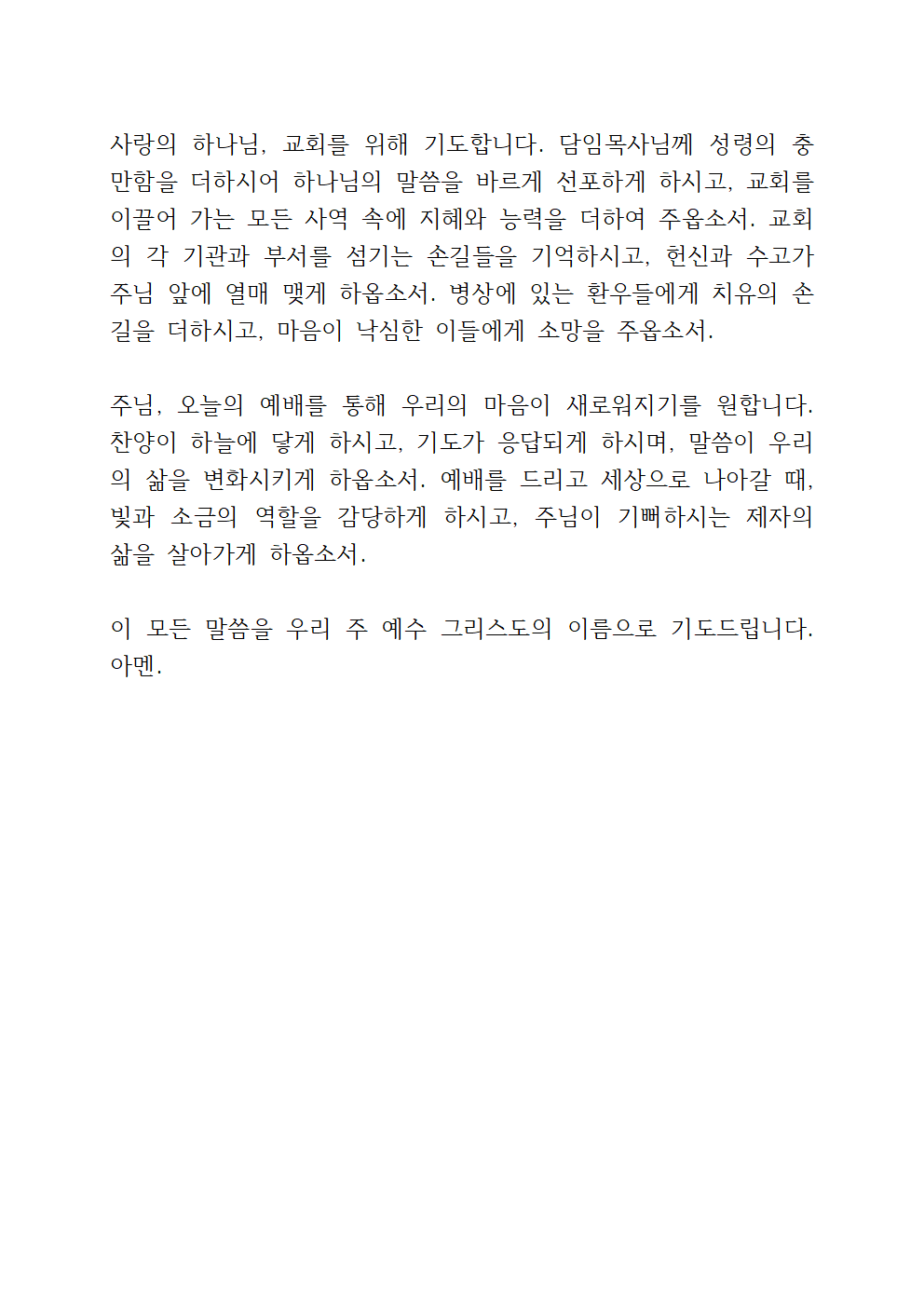 이 모든 기도를 우리 주 예수 그리스도의 이름으로 간절히 드립니다. 아멘.