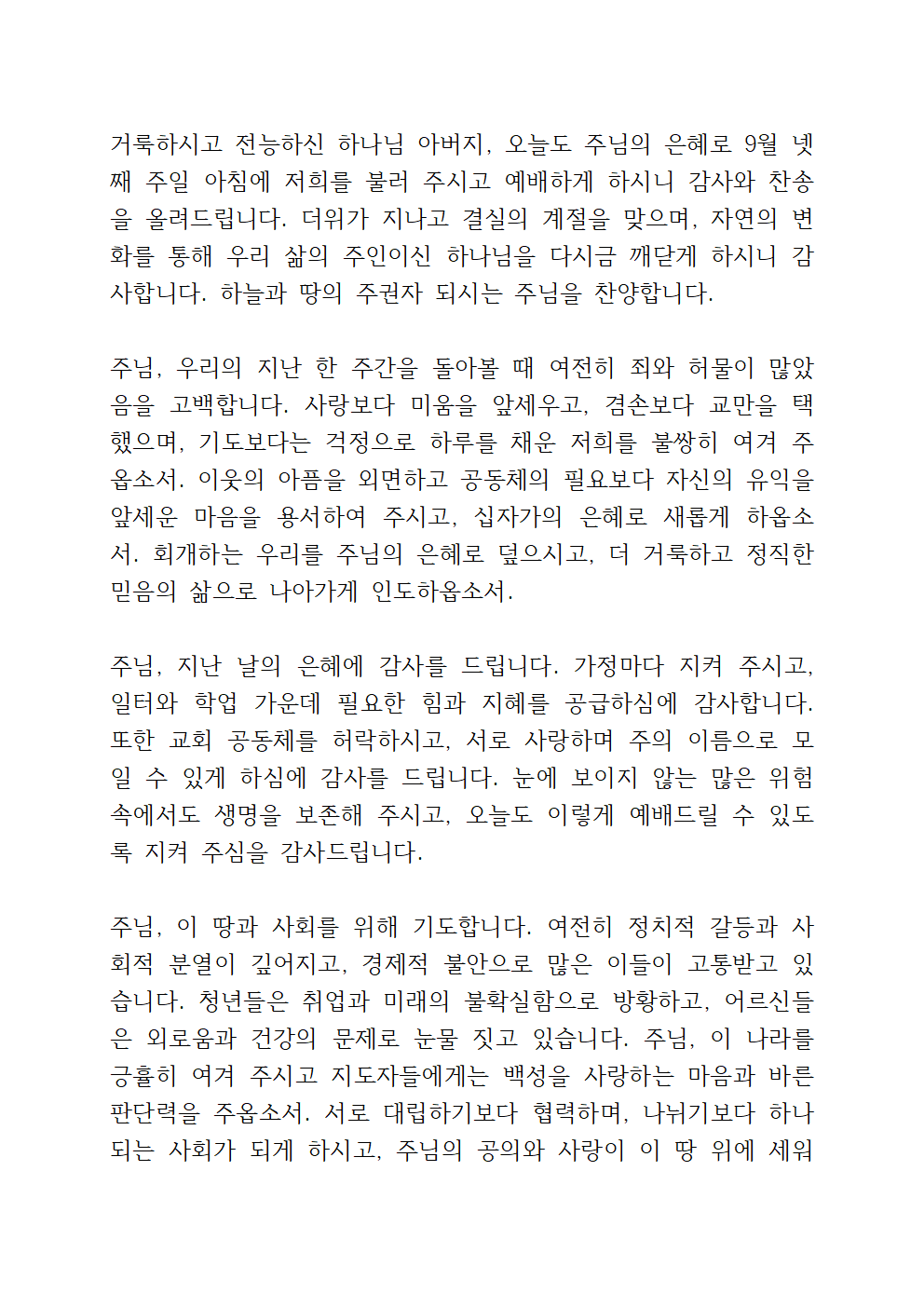 9월 주일 낮 예배 대표기도문 모음