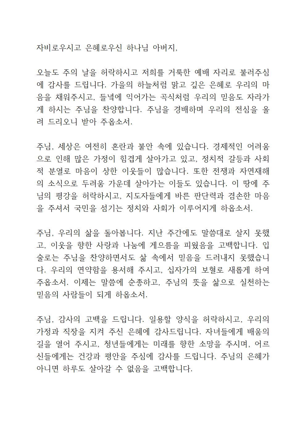 9월 넷째 주일 낮 예배 대표기도문