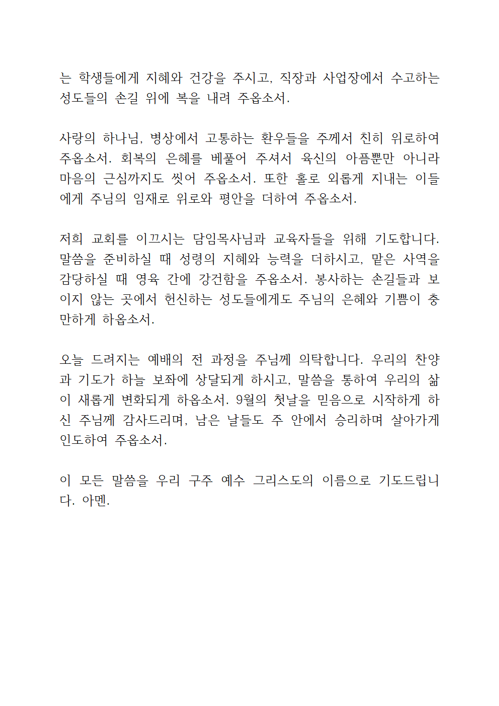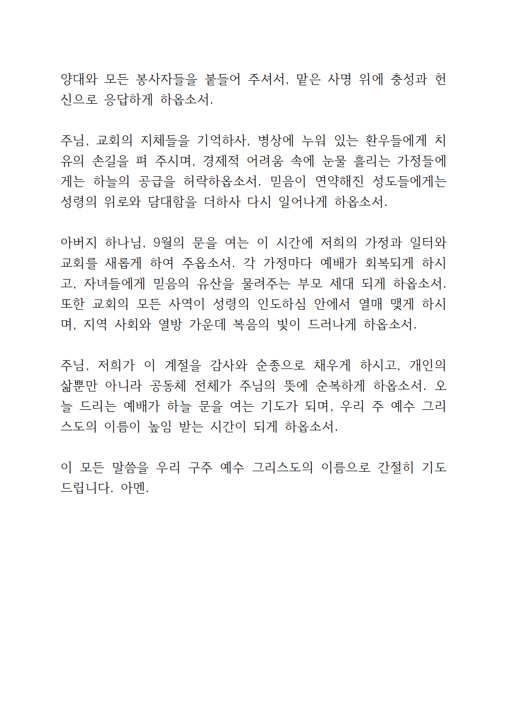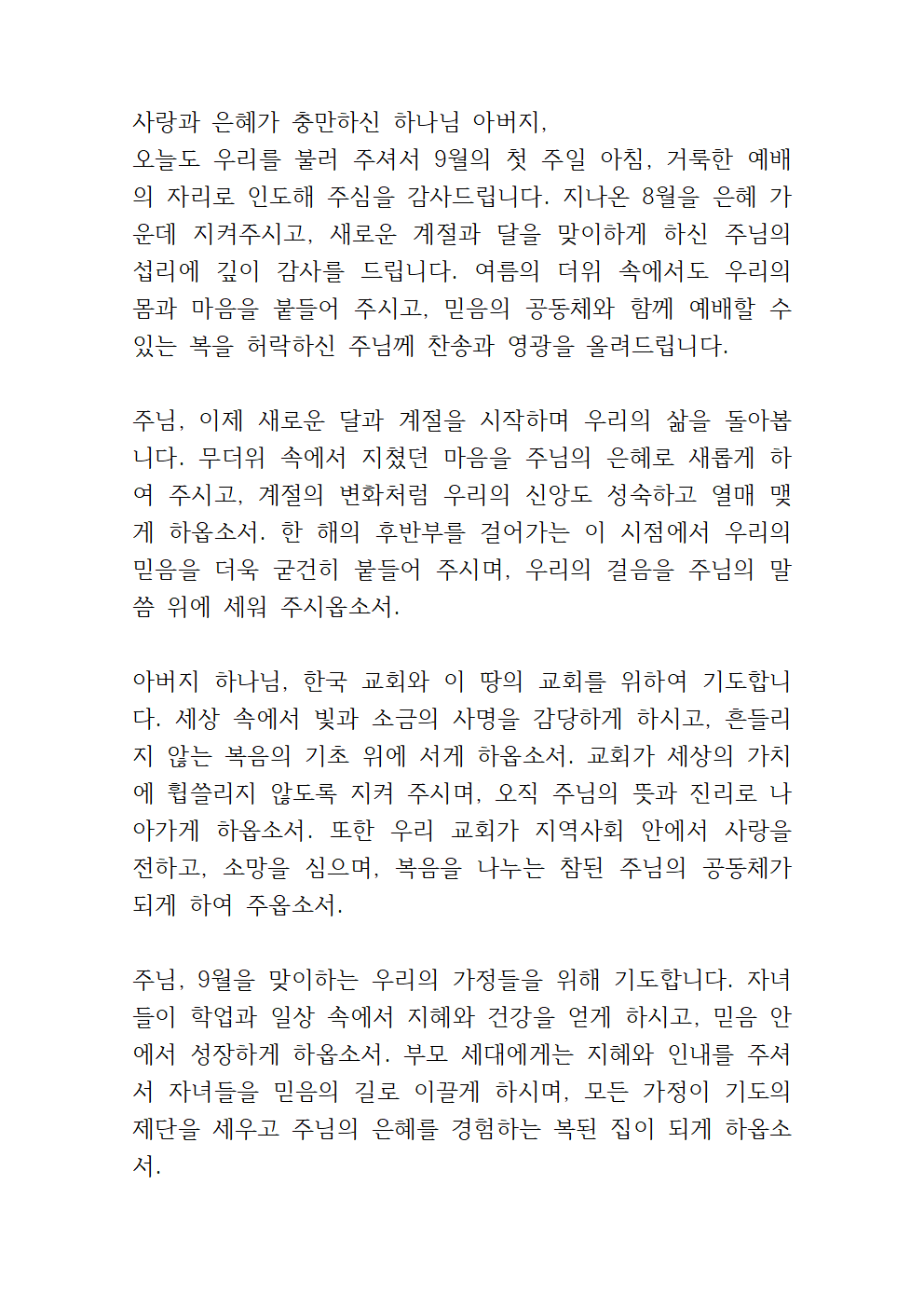 새로운 9월달을 여는 감사와 회개의 고백, 교회를 향한 비전 간구가 담기면 좋을 것 같습니다.