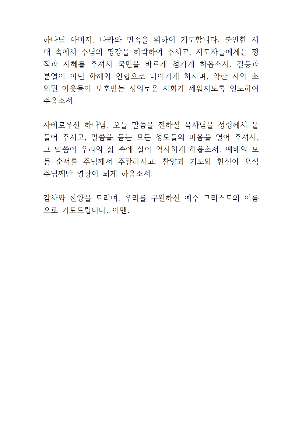 사랑의 하나님, 이 땅과 민족을 붙들어 주옵소서. 국제 정세와 경제의 불안 속에 서민들의 삶이 무거운 짐을 지고 있습니다. 갈등과 분열로 상처 입은 사회에 화해와 소망의 빛을 비추어 주옵소서. 지도자들에게는 지혜와 공의를 주셔서 국민을 바르게 이끌게 하시고, 특별히 청년 세대와 가난한 이들을 향한 정책들이 실질적으로 시행되게 하옵소서. 교회가 세상의 빛과 소금으로서 먼저 희망의 길을 열어가는 사명을 감당케 하옵소서.