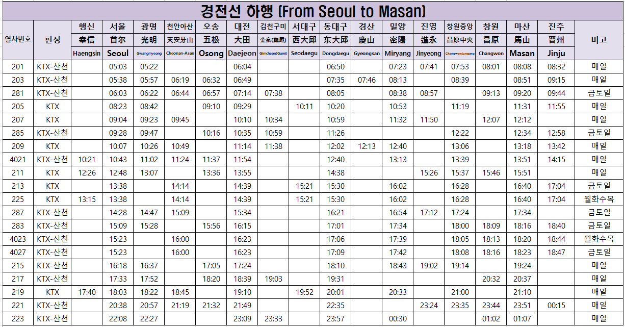 KTX 경전선 노선도, 시간표