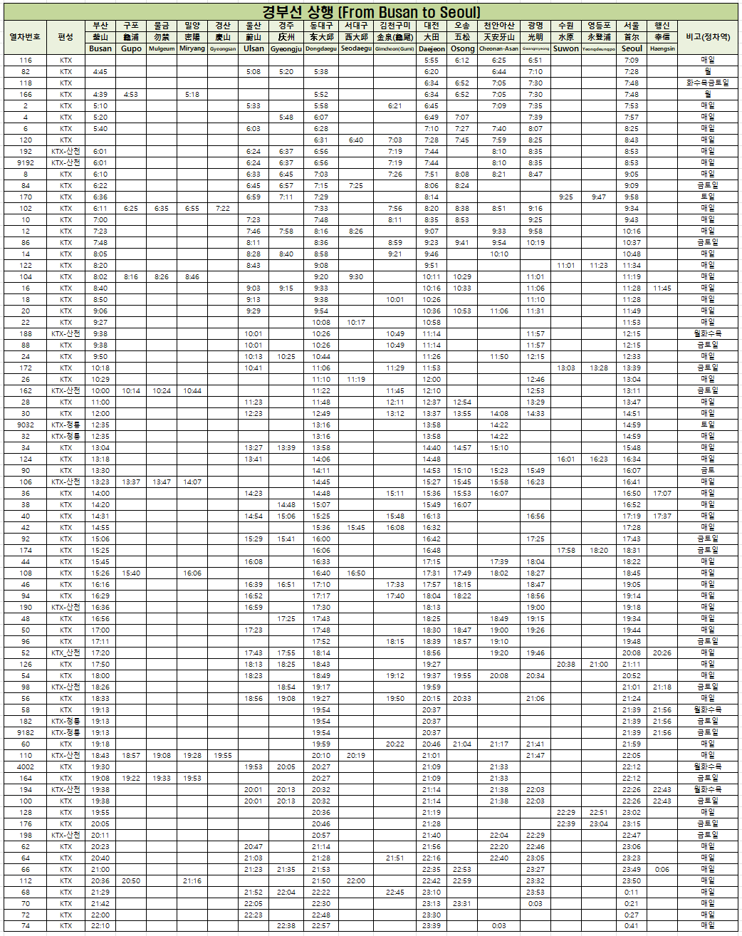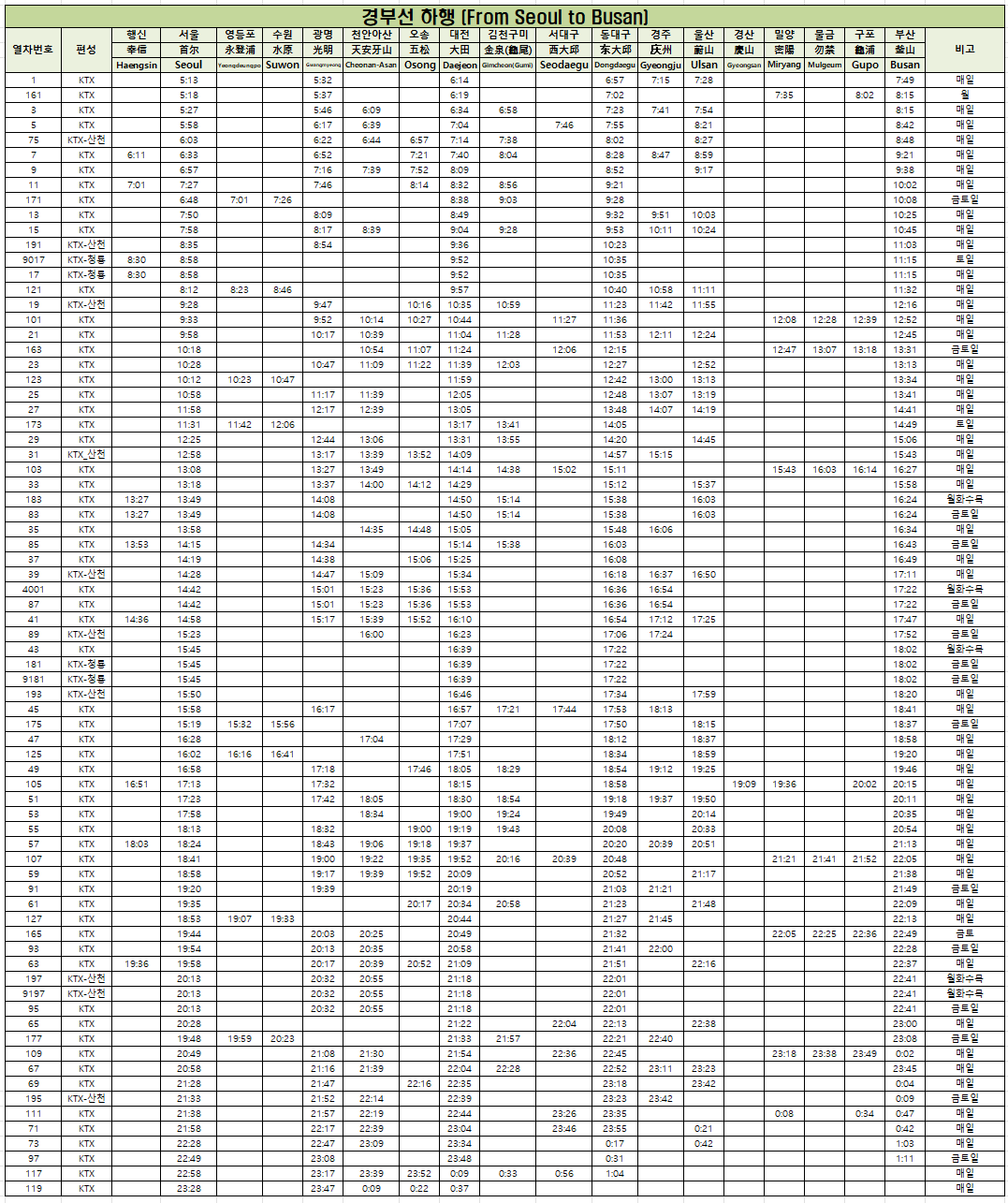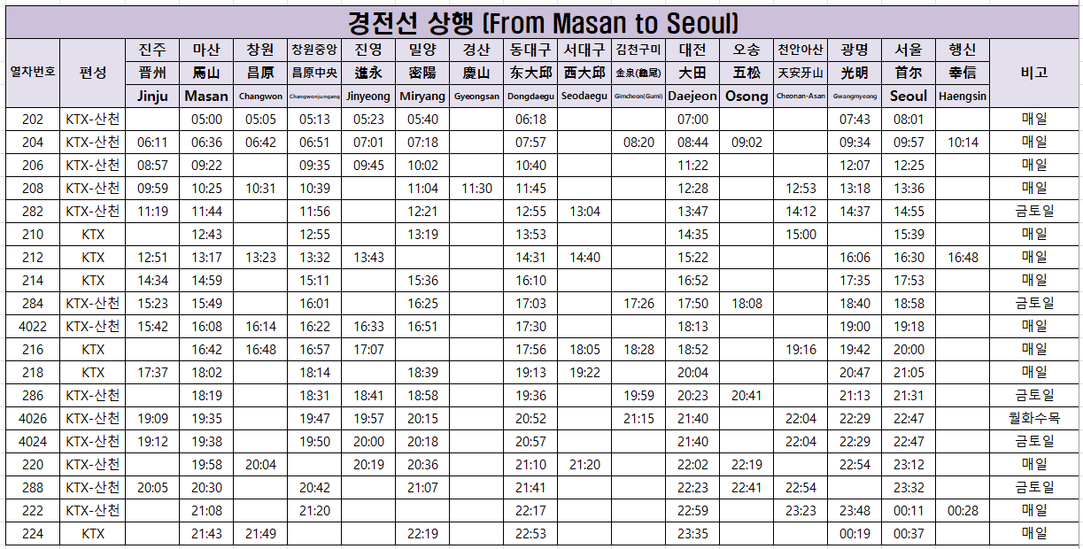 KTX 경부선 노선도, 시간표