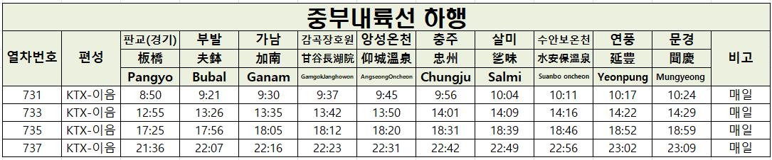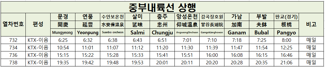 KTX 중부내륙선 노선도, 시간표
