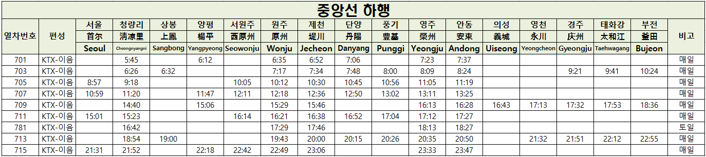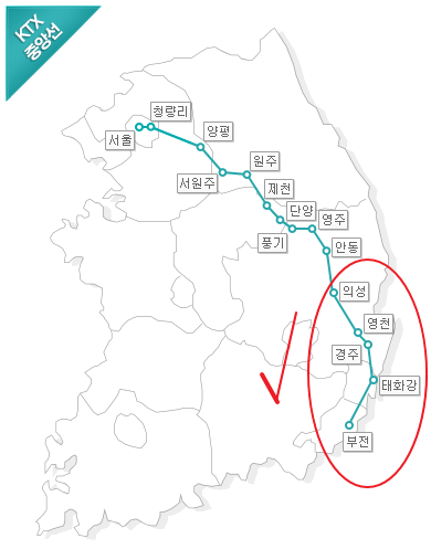 KTX 중앙선은 이번에 안동~부산(부전)까지 연장되어서 더욱 인기가 많습니다.~!!