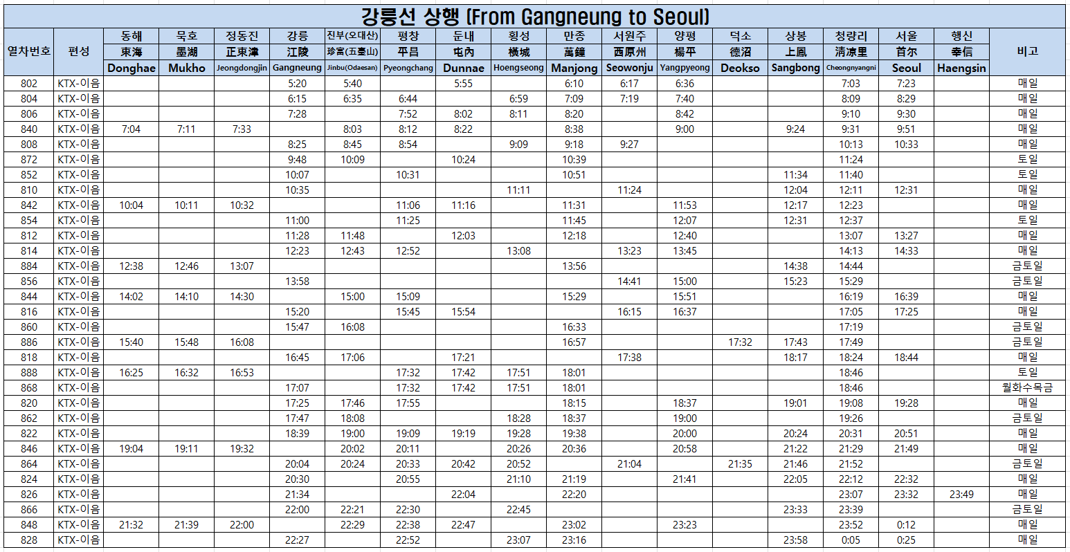 KTX 강릉선 노선도, 시간표