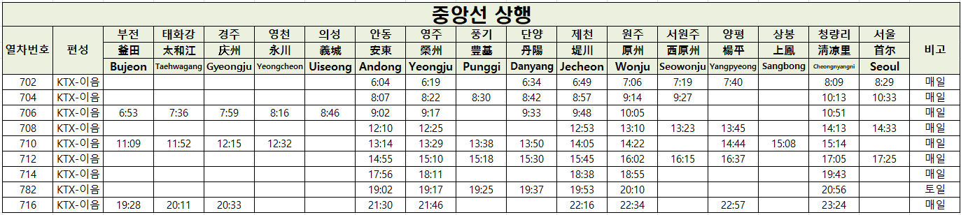 KTX 중앙선 노선도, 시간표